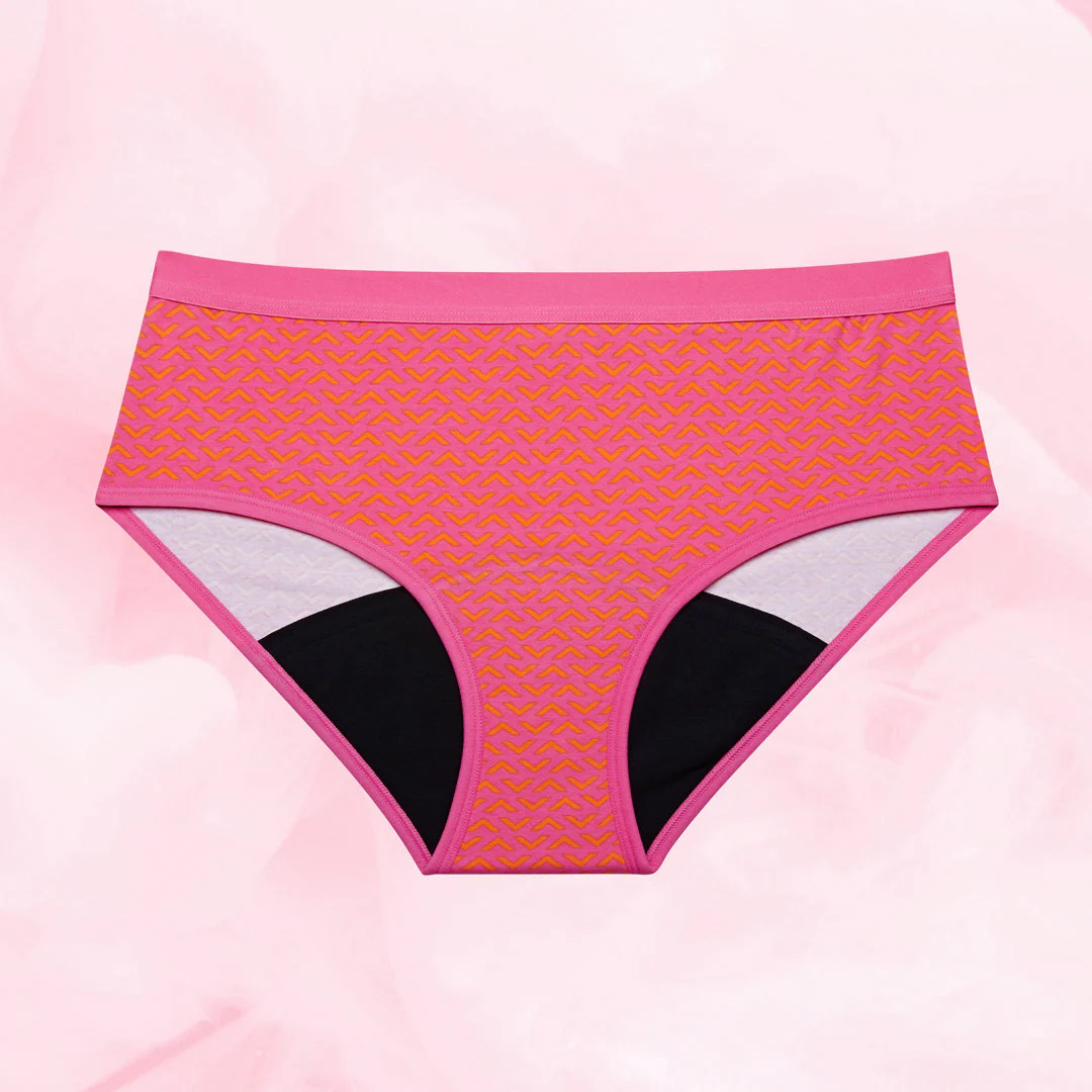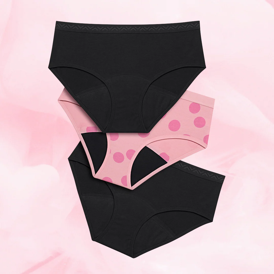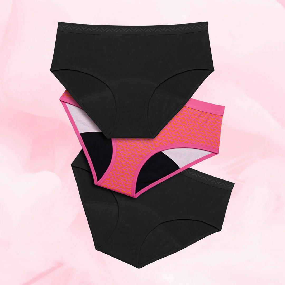 Étoffe votre garde-robe avec ce lot de 3 culottes menstruelles lavables pour ados et sois prête pour tout ce que la journée te réserve ! Sens-toi au sec, protégée et confiante en toutes circonstances : en classe, lorsque tu sors avec des amis et la nuit. Le gousset triple couche absorbe et retient le sang, tandis que le coton certifié biologique doux et durable assure un maximum de confort pour la peau délicate de la zone V. Pense à choisir la bonne taille pour un ajustement parfait. Profite de sa jolie coupe taille basse et de son design : noir classique, noir et blanc fantaisiste ou rose et orange, avec un motif en V audacieux. Bénéficie d’une protection fiable pendant les jours de flux modéré. Cette culotte menstruelle pour ados absorbe parfaitement le sang, point final. Pas besoin de plan B !