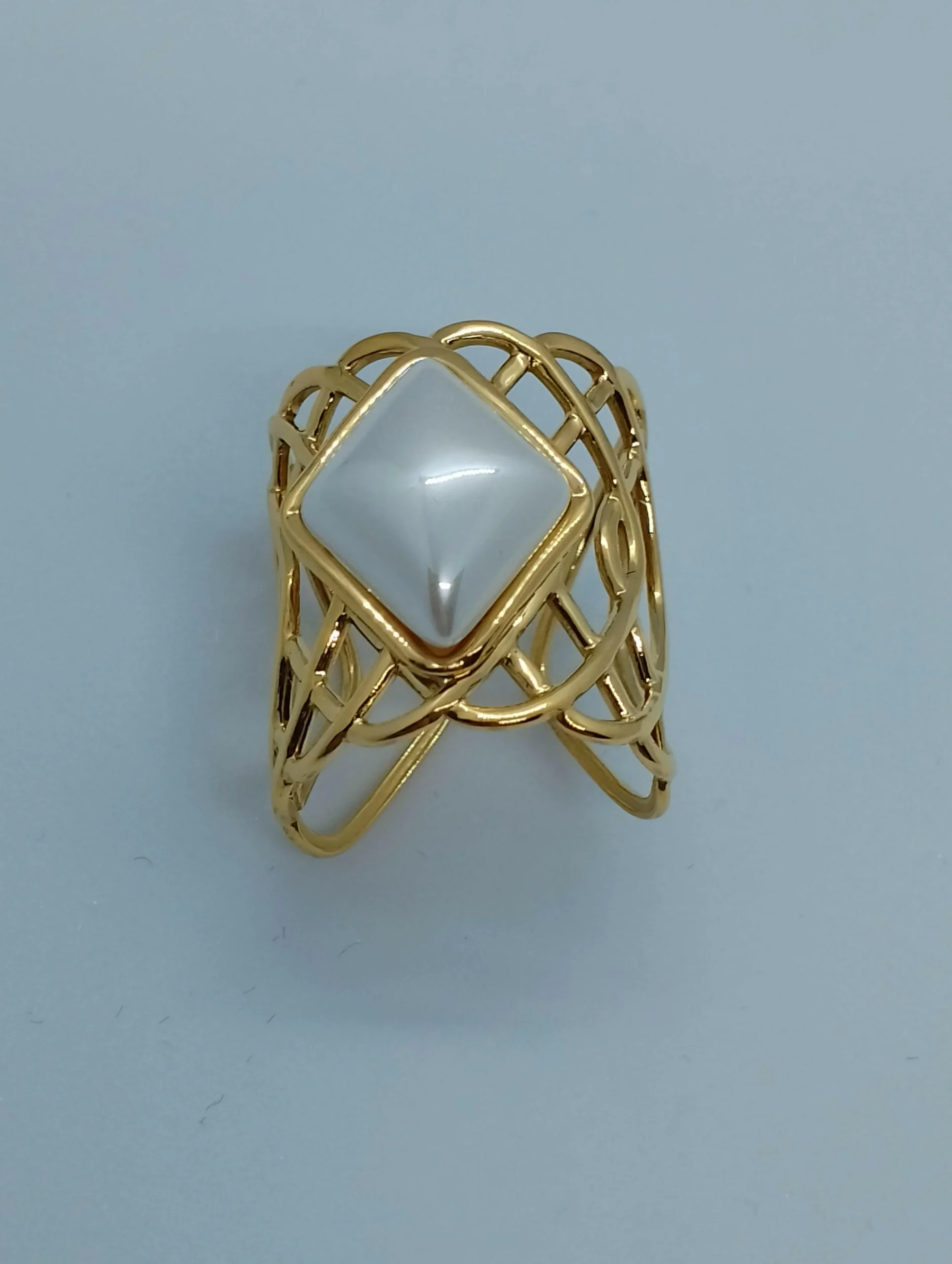 La Bague Agatha est une bague en acier inoxydable, sans nickel et de couleur dorée, composée d’une imitation perle blanche en forme de losange. Hauteur : 2,5cm. Ce produit est légèrement ajustable grâce à son ouverture, et disponible en taille unique.