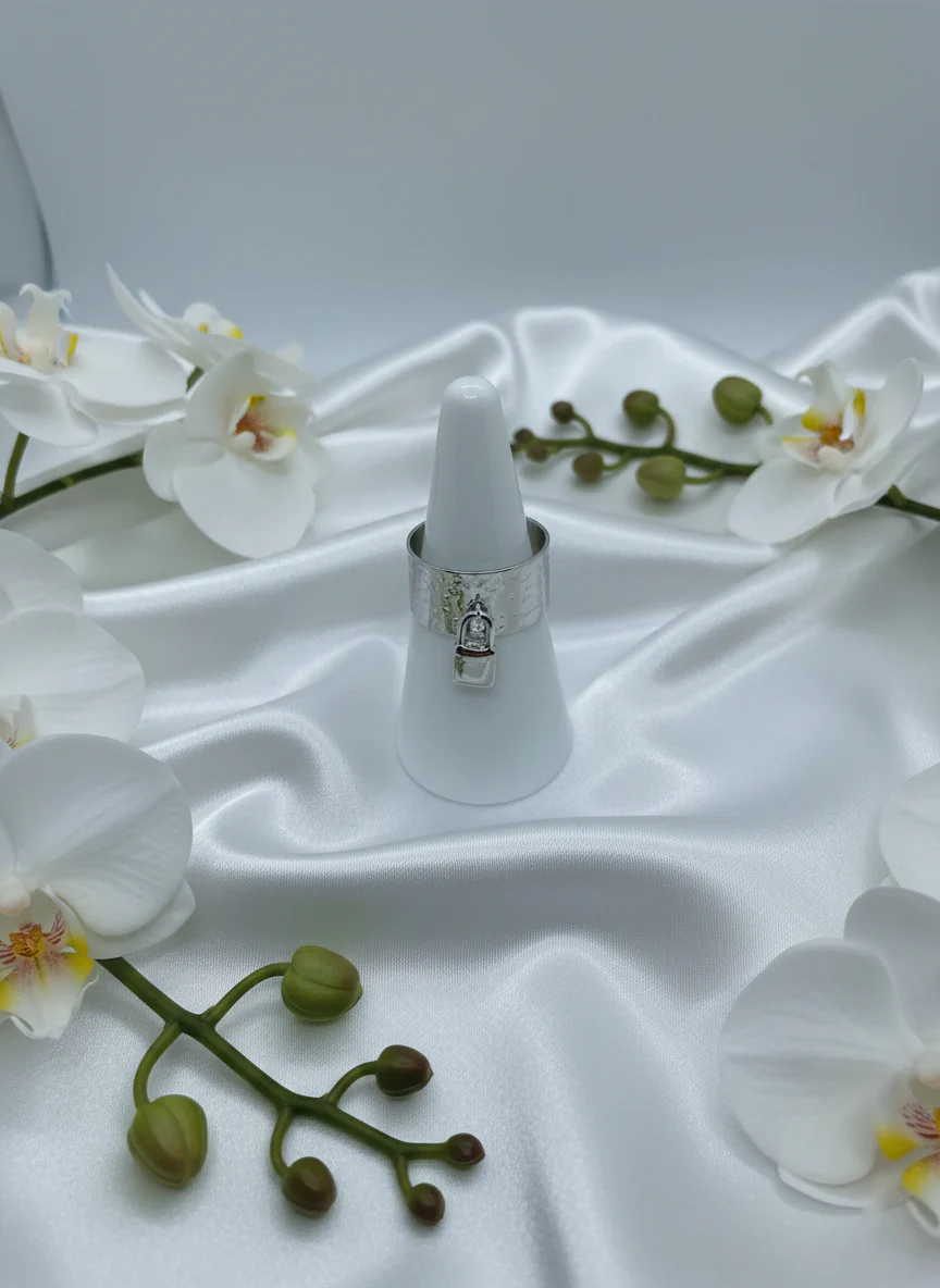 La Bague Amélia est une bague en acier inoxydable à effet martelé, sans nickel, de couleur argentée et composée d’un cadenas non fixe. Ce produit est légèrement ajustable grâce à son ouverture.