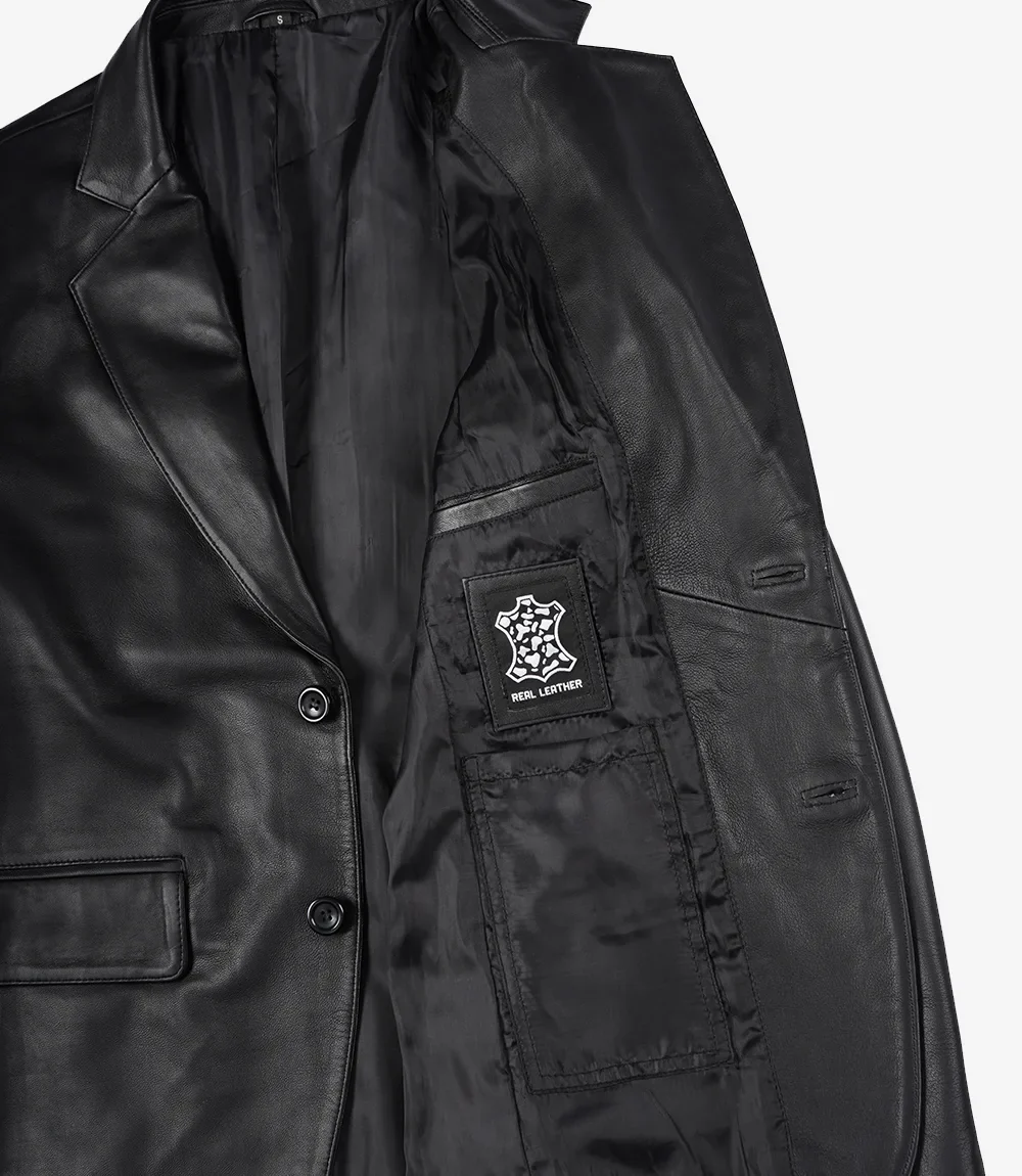 Découvrez le blazer en cuir noir pour homme, alliant à la perfection style classique et esthétique moderne. Confectionné en cuir de première qualité, ce blazer arbore un élégant revers cranté à deux boutons qui rehausse son élégance. Sa coupe longue en cuir respire la sophistication, ce qui en fait une pièce polyvalente pour toutes les occasions, des réunions d’affaires aux sorties nocturnes.