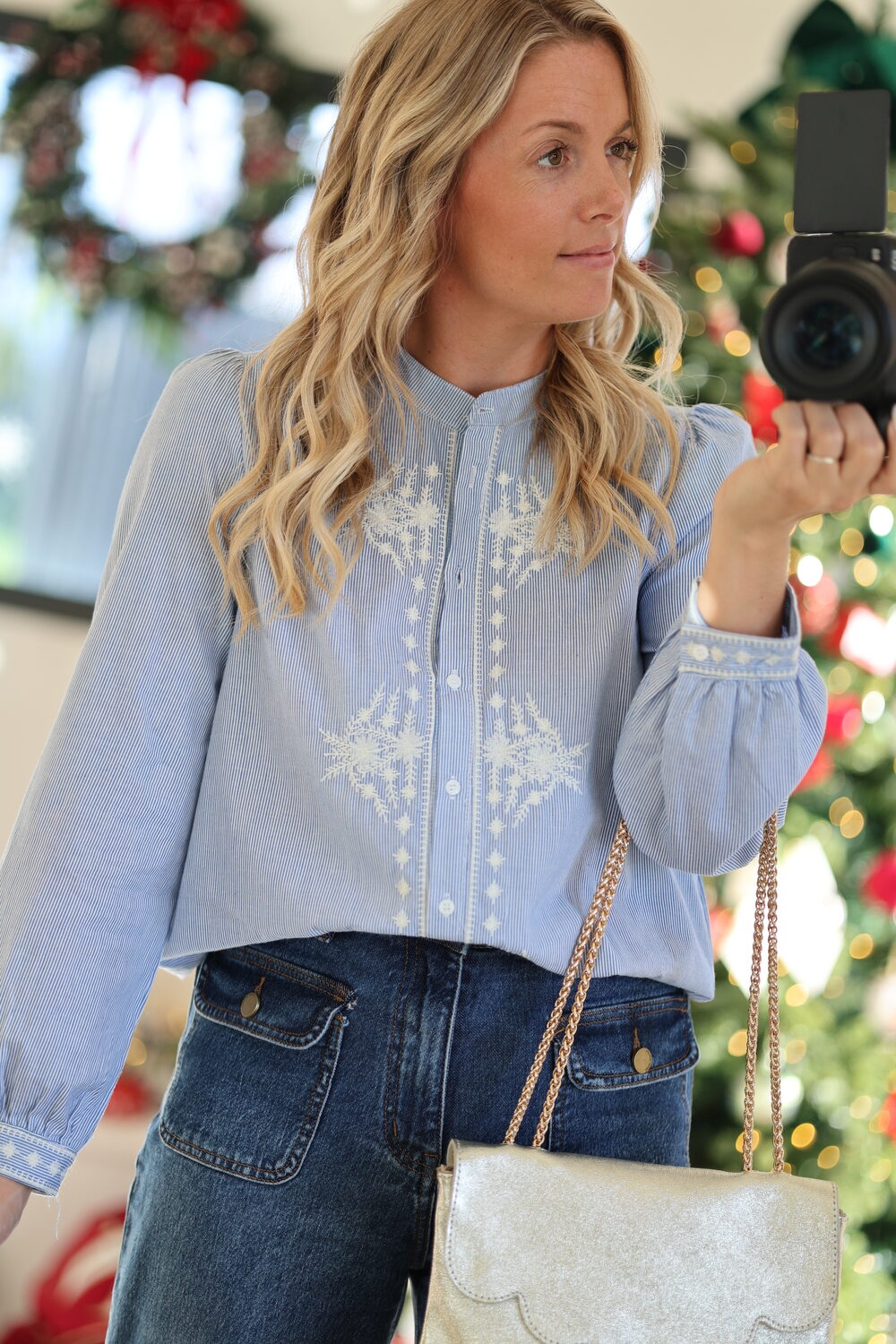 Blouse EDWIGE – Bleue Blouse Coloris : bleu & blanc Col légèrement montant Manches longues Broderie Rayée Boutons Tailles = S/M – M/L Longueurs = S/M : 62 cm , M/L : 63 cm Largeurs sous aisselles = S/M : 52 cm, M/L : 54 cm Composition : 100% coton Le modèle porte du S/M et mesure 1m65 Accessoires portés par le mannequin : Jean’s LAVIDA, Sac BENODET Or