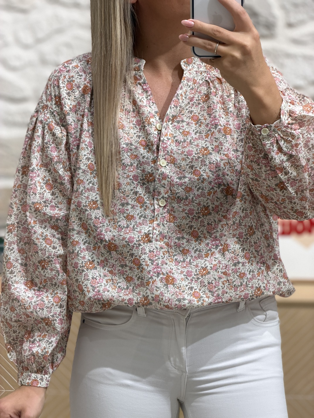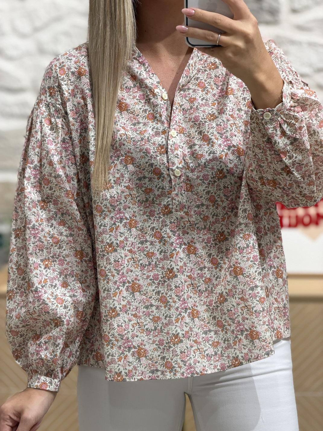 Blouse FLOWERS – ÉCRUE/ORANGE Blouse Coloris : écru, orange, saumon & vert Col V Manches longues Imprimé fleuri Boutons Tailles = S/M – M/L Longueurs = S/M : 60 cm , M/L : 61 cm Largeurs sous aisselles = S/M : 60 cm, M/L : 62 cm Composition : 100% coton Le modèle porte du S/M et mesure 1m65 Accessoires portés par le mannequin : Jean’s NICKY Blanc, Gilet sans manches ÉLIE Crème, Basket HORUS Rose