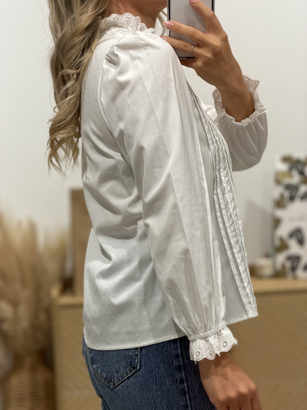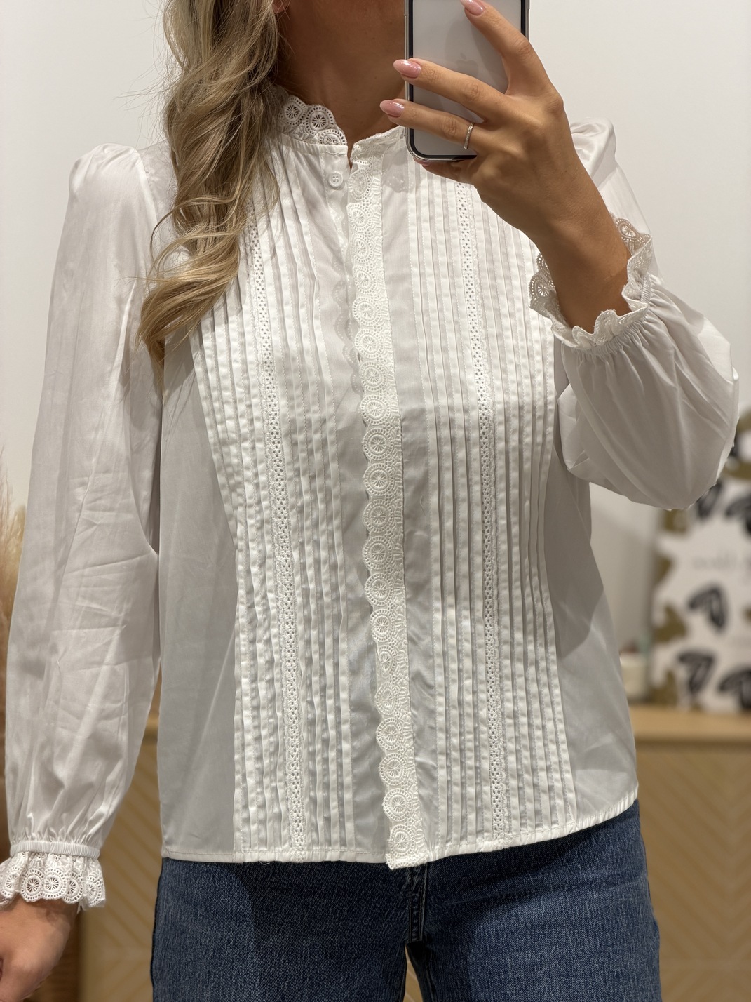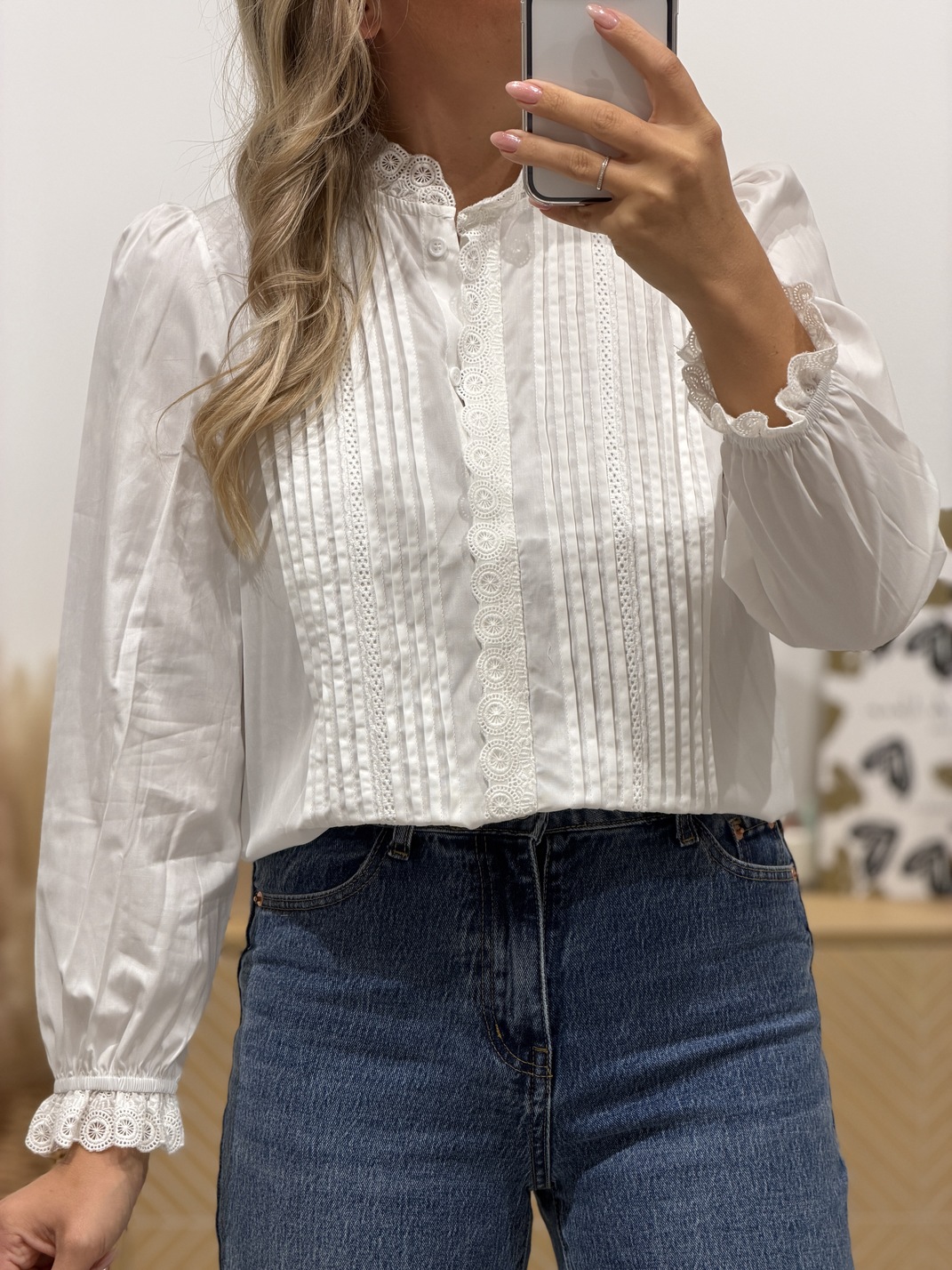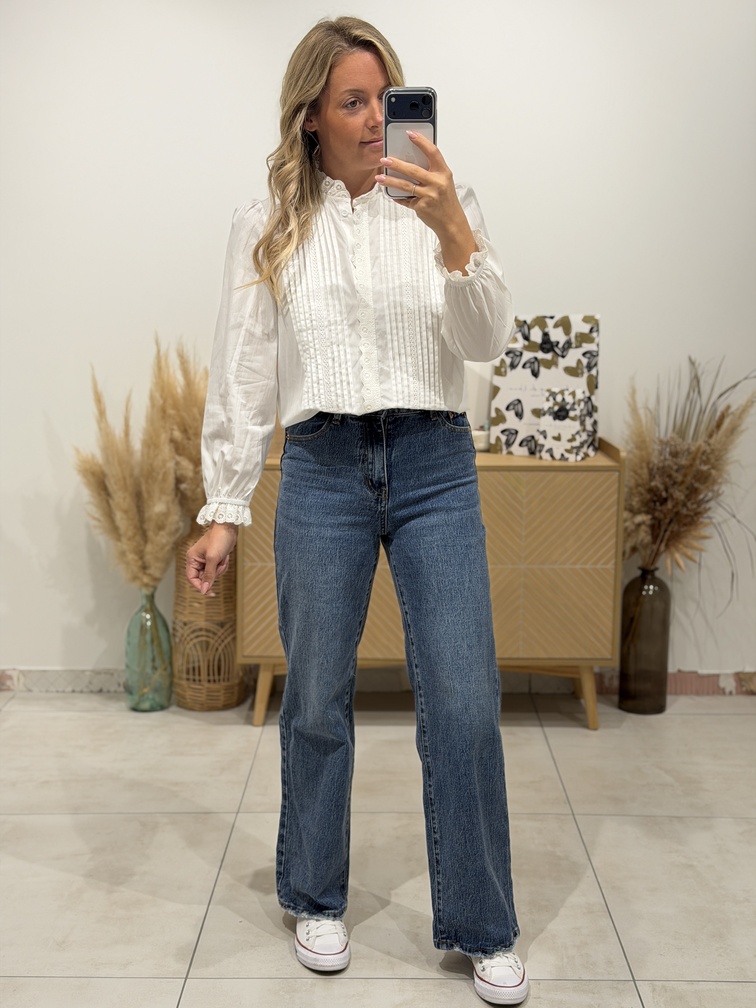 Blouse GWENN Blouse Couleur : Blanche Manches longues Col légèrement montant Détails dentelle Boutons Tailles = S : 36, M : 38, L : 40 Longueurs = S : 60 cm, M : 61 cm, L : 62 cm Largeurs sous aisselles = S : 48 cm, M : 50 cm, L : 52 cm Composition : 100% coton Le modèle porte du S et mesure 1m65 Accessoires portés par le mannequin : Jean’s COREY