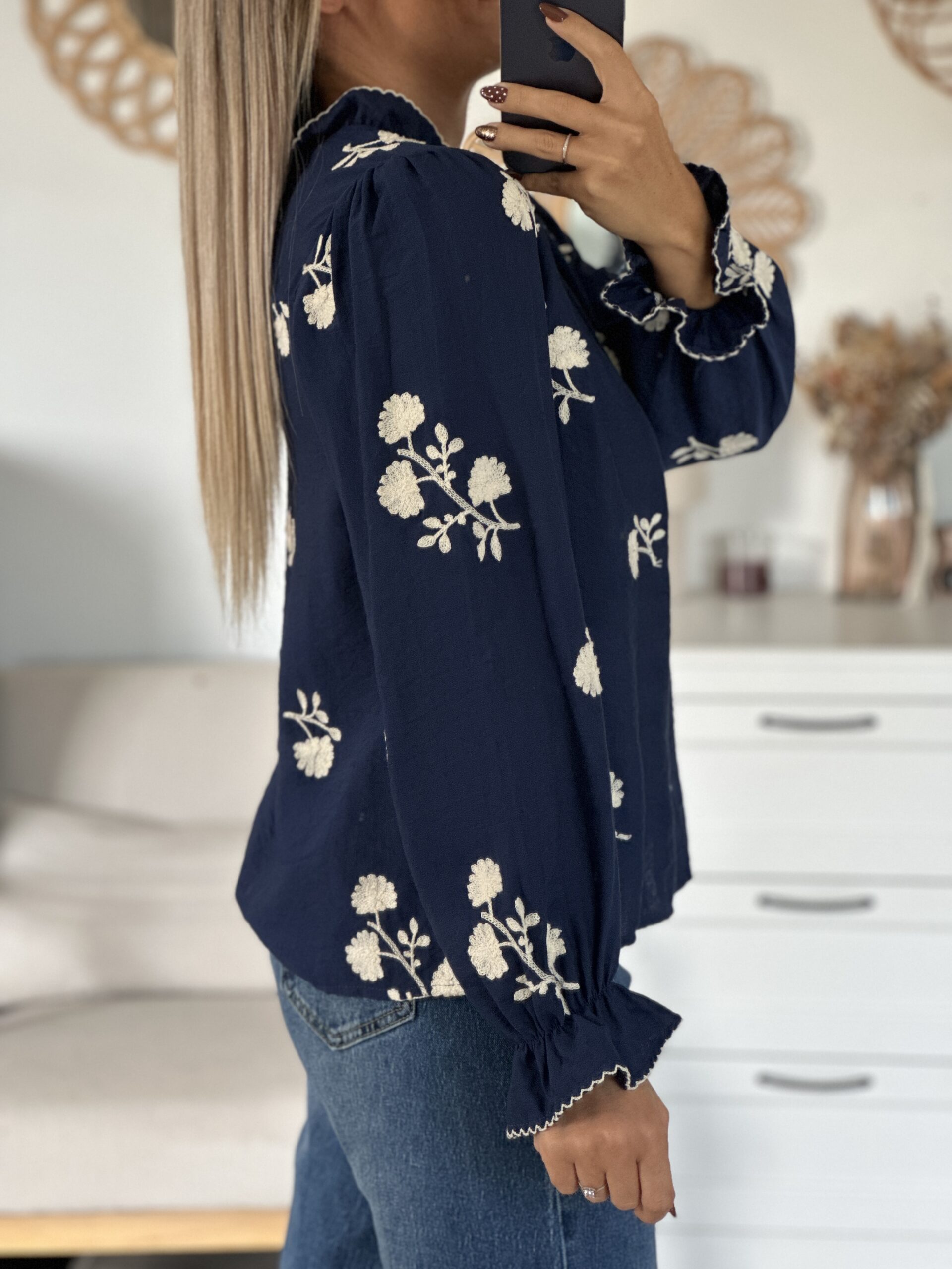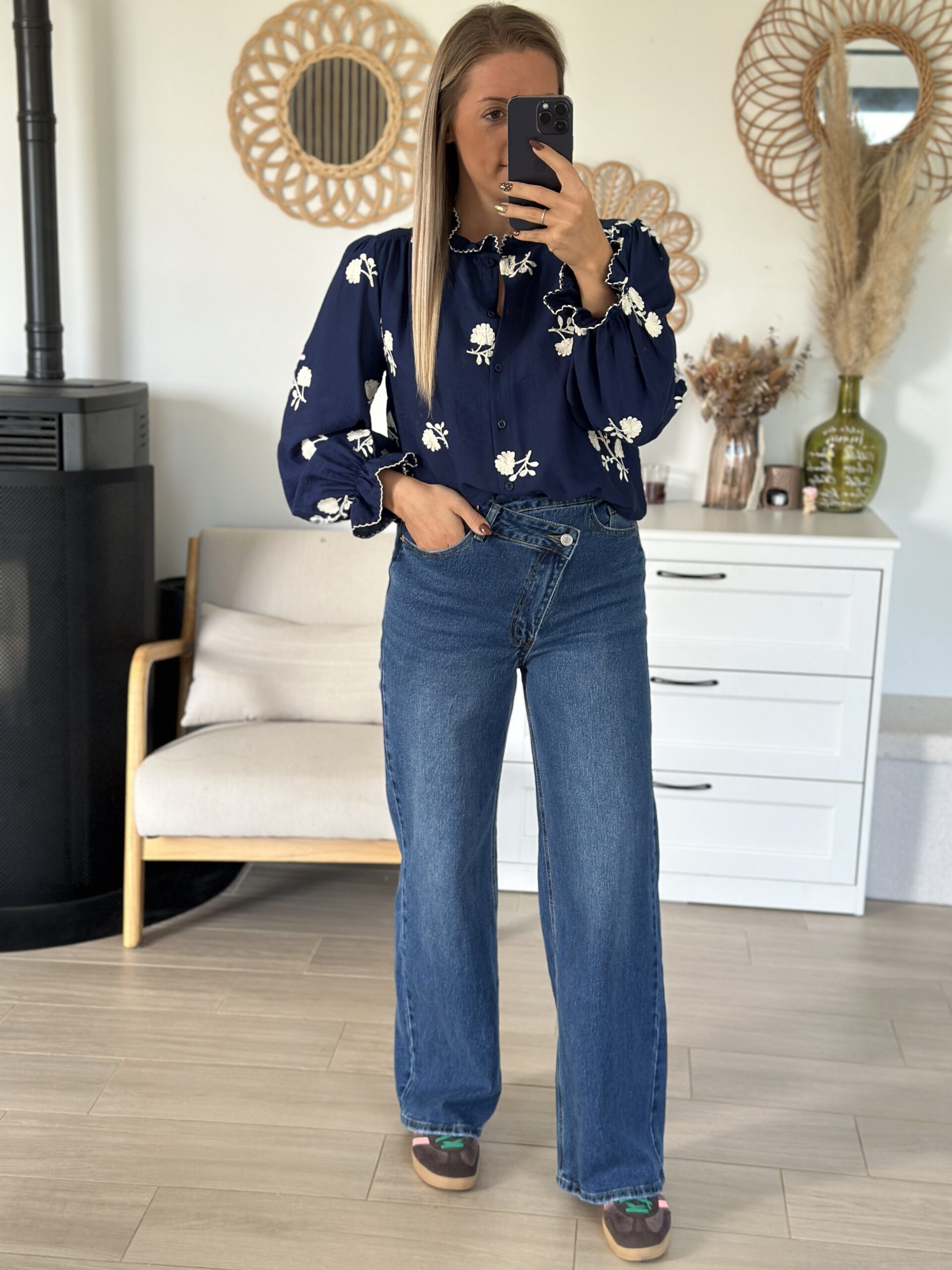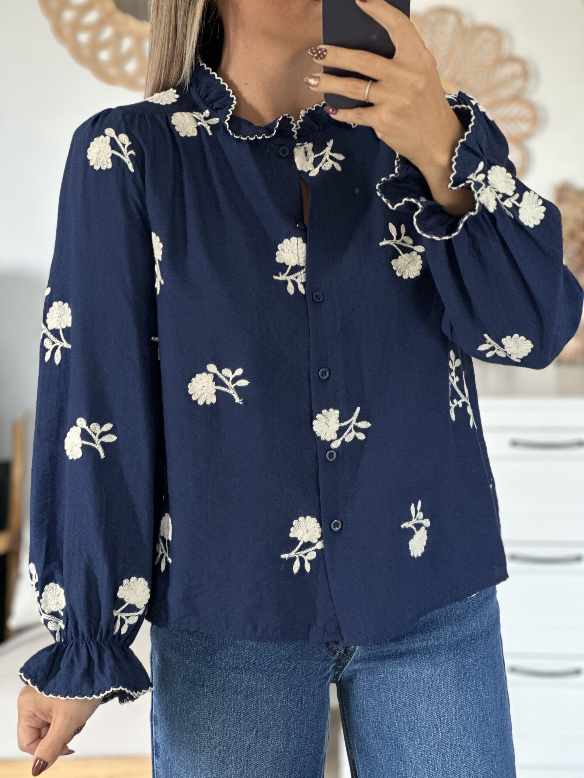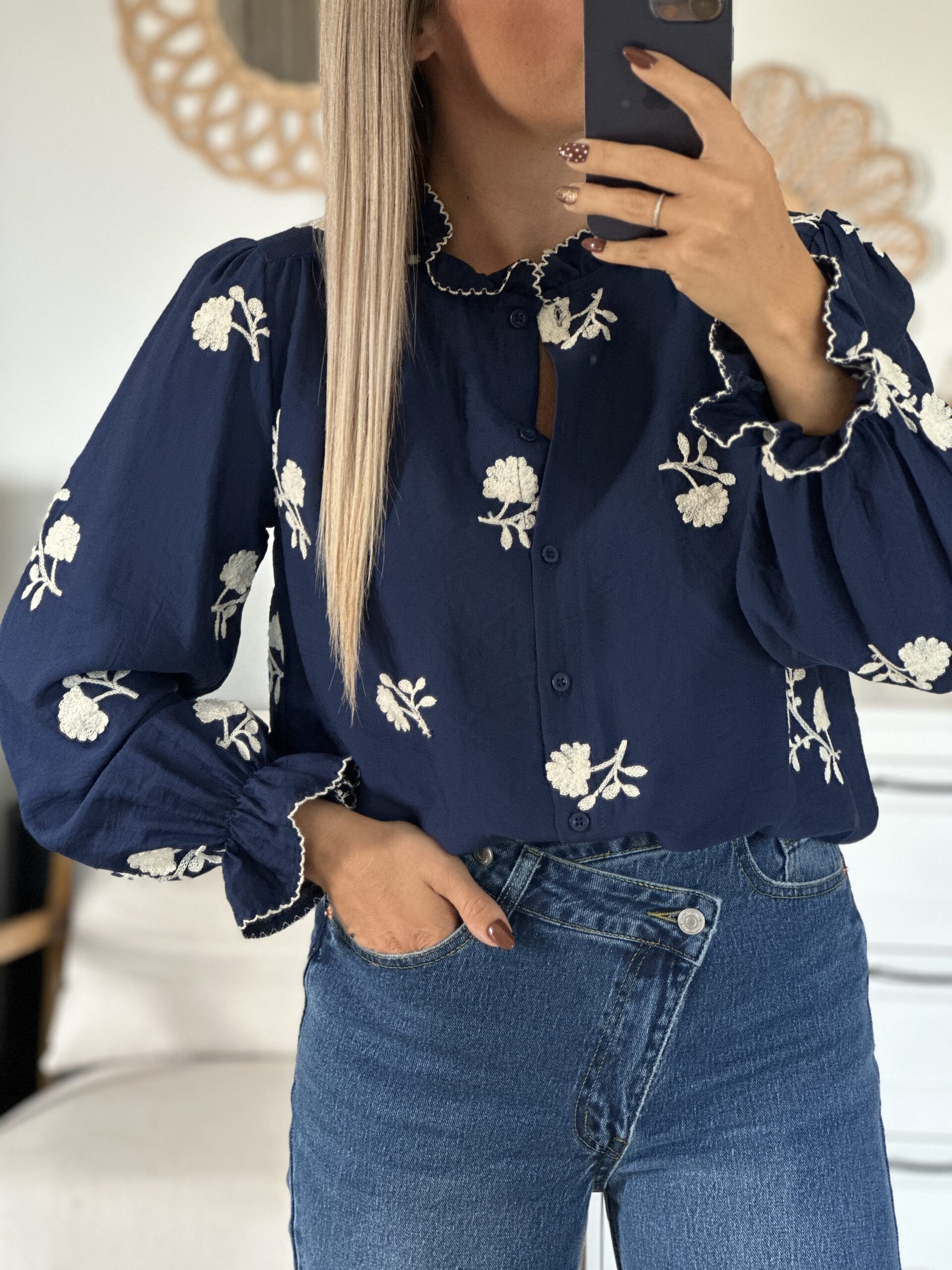 Blouse HERBIER – Bleue Blouse Coloris : bleu & blanc Manches longues Col légèrement montant Fleurs brodées Tailles = S : 36, M : 38, L : 40 Longueurs = S : 58 cm, M : 59 cm, L : 60 cm Largeurs sous aisselles = S : 51 cm, M : 53 cm, L : 55 cm Composition : 90% viscose, 10% polyester Le modèle porte du S et mesure 1m65
