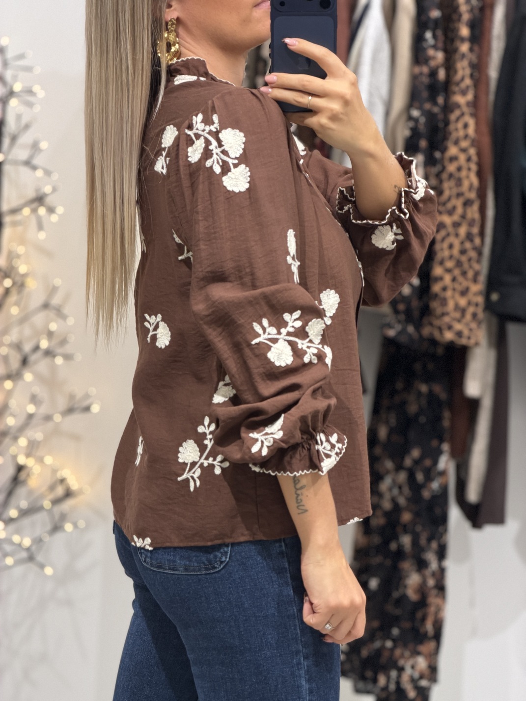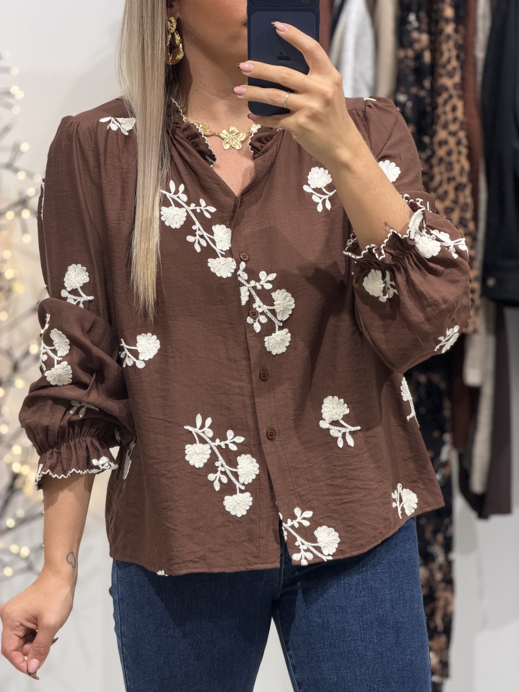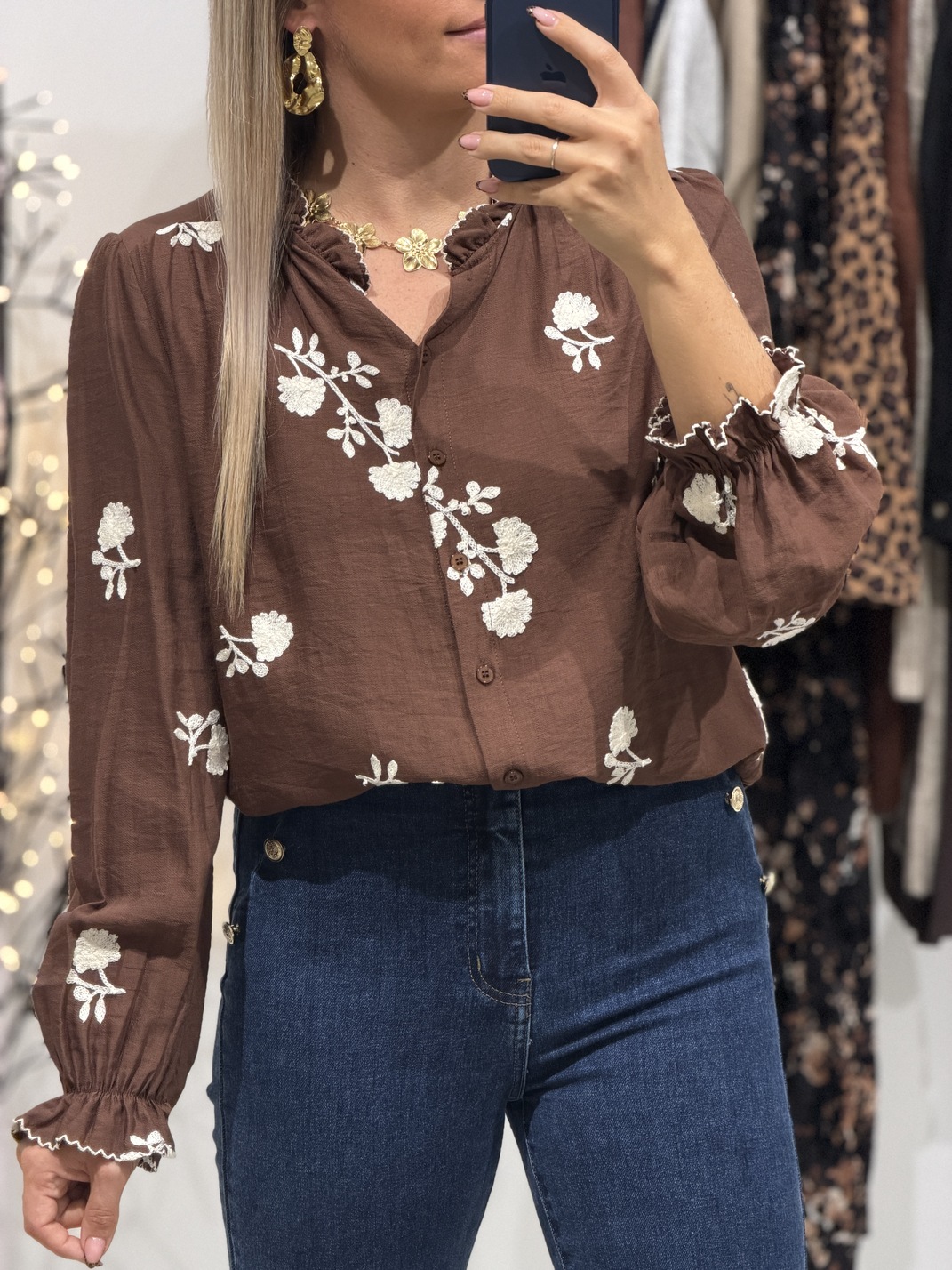 Blouse HERBIER – Chocolat Blouse Coloris : chocolat & blanc Manches longues Col légèrement montant Fleurs brodées Tailles = S : 36, M : 38, L : 40 Longueurs = S : 58 cm, M : 59 cm, L : 60 cm Largeurs sous aisselles = S : 51 cm, M : 53 cm, L : 55 cm Composition : 90% viscose, 10% polyester Le modèle porte du S et mesure 1m65 Accessoires portés par le mannequin : Jean’s MATELOT