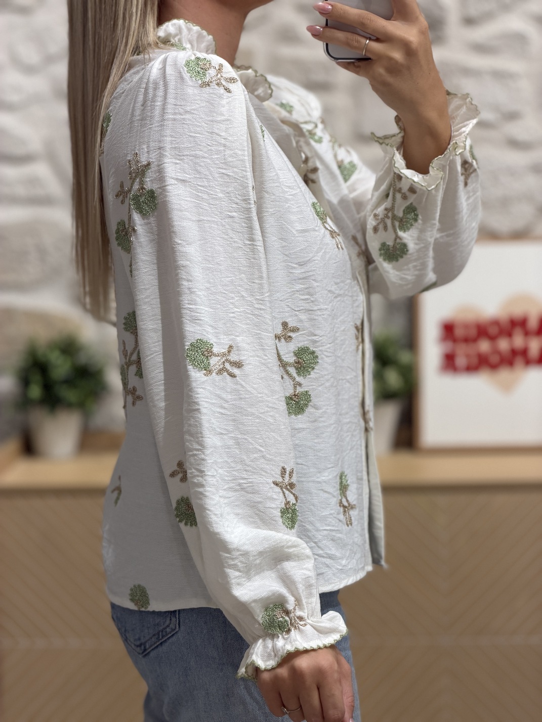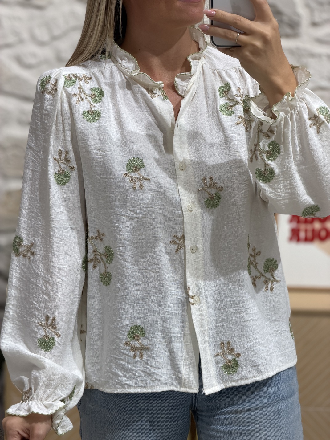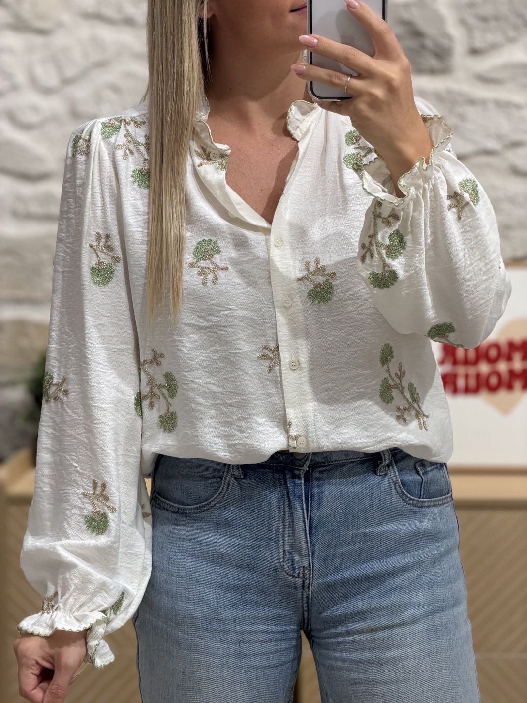 Blouse LOLA – Blanche Blouse Coloris : blanc, kaki & marron Manches longues Col légèrement montant Fleurs brodées Tailles = S : 36, M : 38, L : 40 Longueurs = S : 58 cm, M : 59 cm, L : 60 cm Largeurs sous aisselles = S : 51 cm, M : 53 cm, L : 55 cm Composition : 90% viscose, 10% polyester Le modèle porte du S et mesure 1m65 Accessoires portés par le mannequin : Gilet sans manches ÉLIE Crème