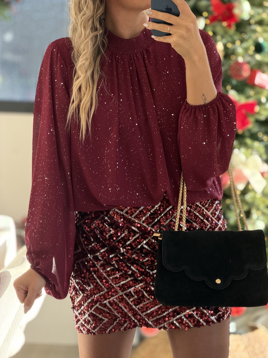Blouse MAGIE – BORDEAUX (Made in Italie) Blouse Coloris : bordeaux & argent Irisée Manches longues Col montant Boutons Fluide Taille unique convient du S/36 au XL/42 Longueur : 59 cm Largeur sous aisselle : 51 cm Composition : 100% polyester Le modèle porte du S habituellement et mesure 1m65 Accessoires portés par le mannequin : Jupe SOLANA Bordeaux, Sac BENODET Noir, Bottines EUDORA Noire