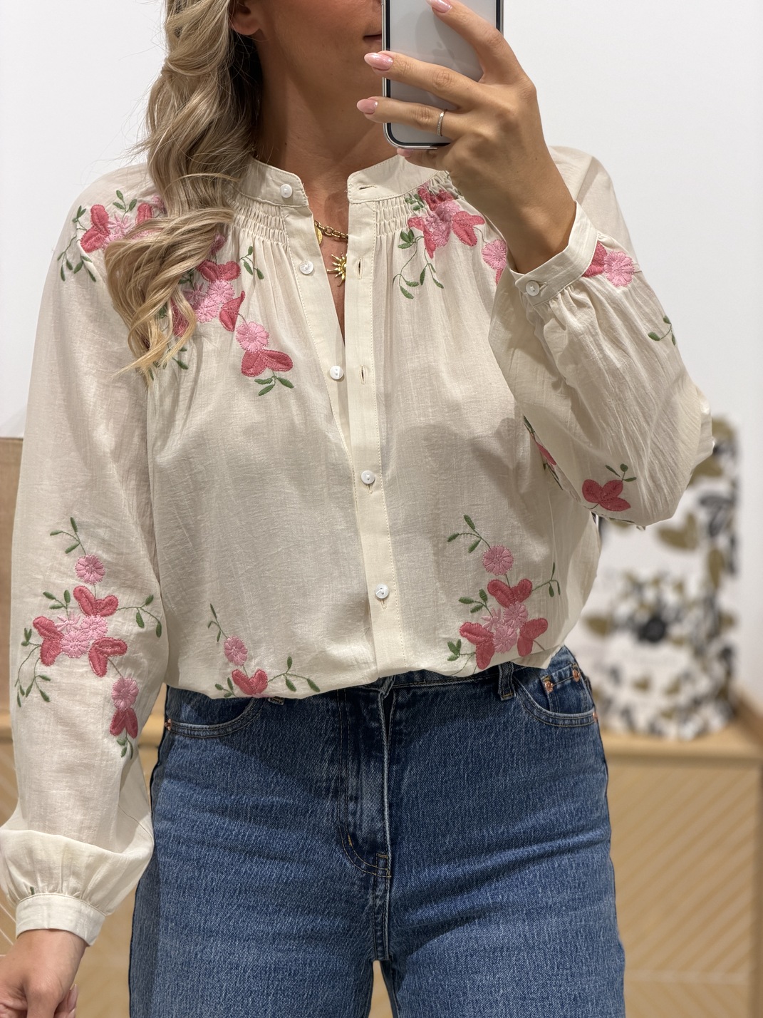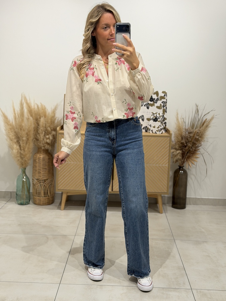 Blouse PRINTEMPS Blouse Coloris : beige, vert, rose & fuchsia Col légèrement montant Manches longues Fleurs brodées Boutons Tailles = S/M – M/L Longueurs = S/M : 65 cm , M/L : 67 cm Largeurs sous aisselles = S/M : 55 cm, M/L : 57 cm Composition : 100% coton Le modèle porte du S/M et mesure 1m65 Accessoires portés par le mannequin : Jean’s COREY , Gilet sans manches ELIE Rose