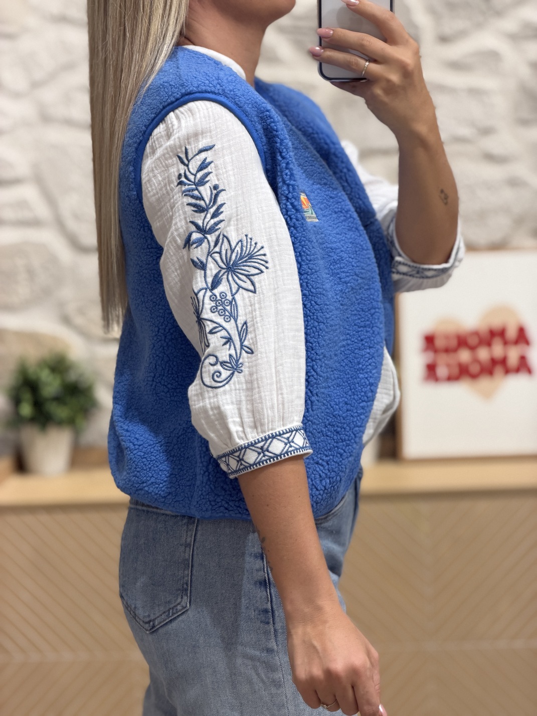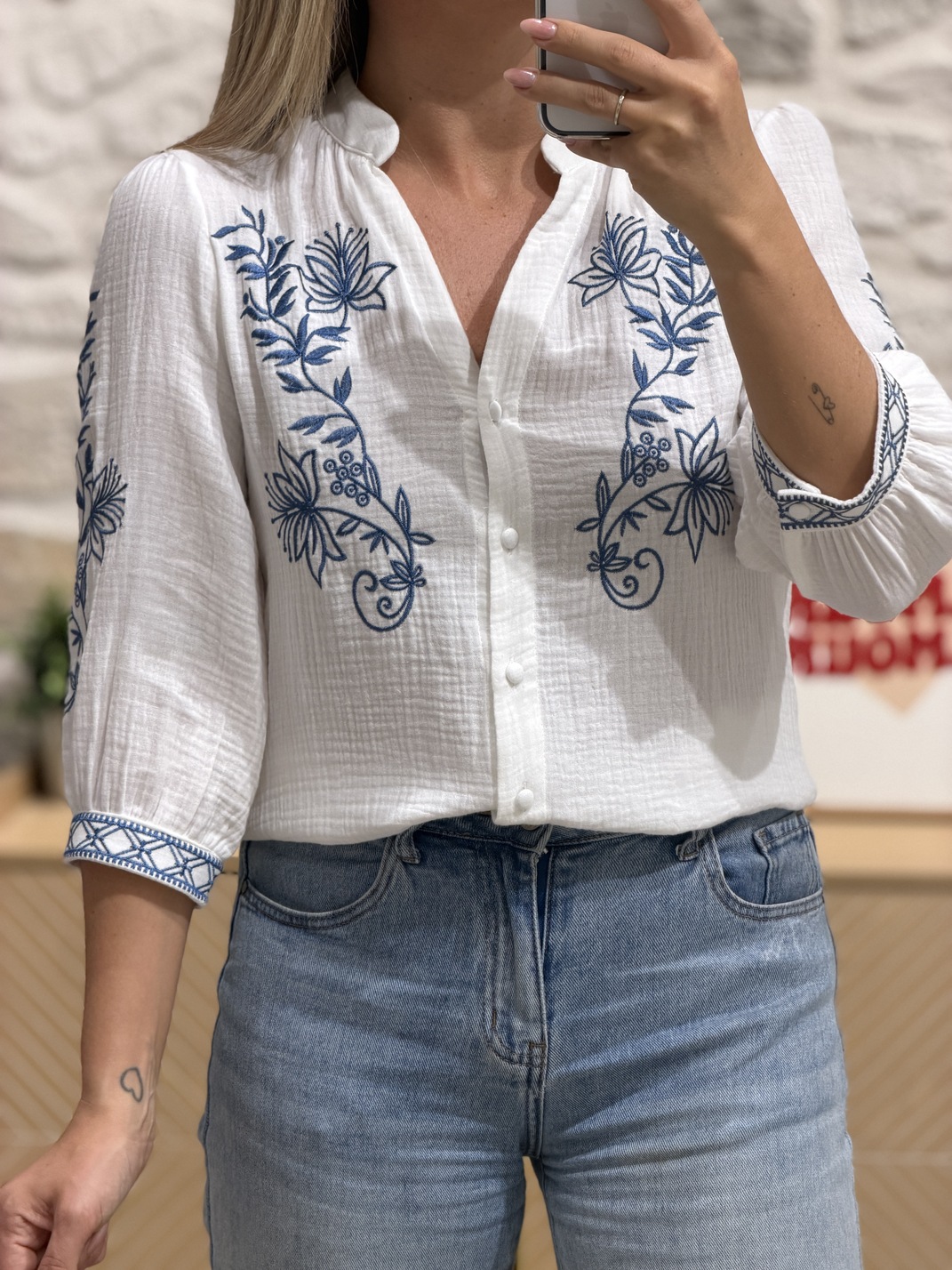 Blouse SPIRALE – BLANCHE – CURVY Blouse Coloris : blanc & bleu Col V Manches 3/4 avec imprimé Fleurs brodées Boutons Tailles = L: 40, XL : 42, 2XL: 44, 3XL : 46 et 4XL : 48 Longueur = L: 67 cm, XL : 68 cm, 2XL : 69 cm, 3XL : 70 cm et 4XL : 71 cm Largeur sous aisselles = L: 50 cm, XL : 52 cm, 2XL : 54 cm, 3XL : 56 cm et 4XL : 58 cm Composition : 100% coton Le modèle porte du S/M et mesure 1m65 Accessoires portés par le mannequin…