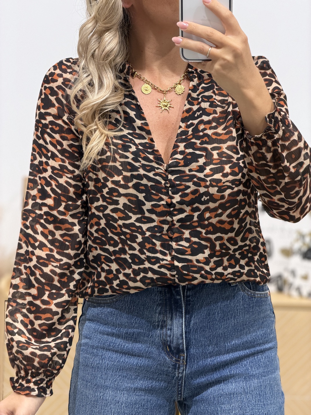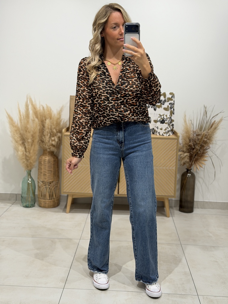 Blouse TALLIA Blouse Coloris : camel, noir & beige Manches longues Col V Motif léopard Boutons Fluide Tailles = S : 36, M : 38, L : 40, XL : 42 Longueurs = S : 59 cm, M : 60 cm, L : 61 cm, XL : 62 cm Largeurs sous aisselles = S : 49 cm, M : 51 cm, L : 53 cm, XL : 55 cm Composition : 100% polyester Le modèle porte du S et mesure 1m65 Accessoires portés par le mannequin : Jean’s COREY