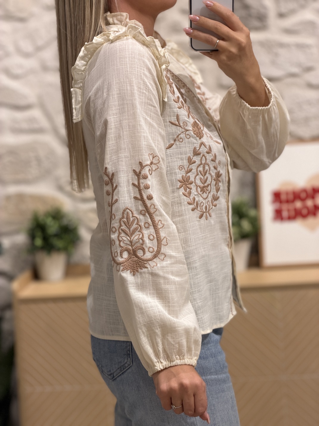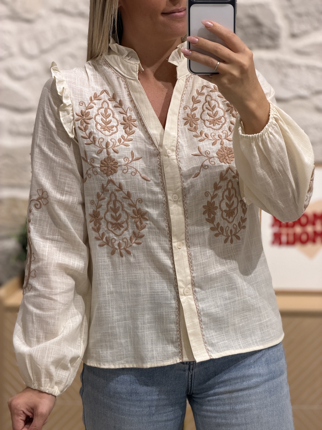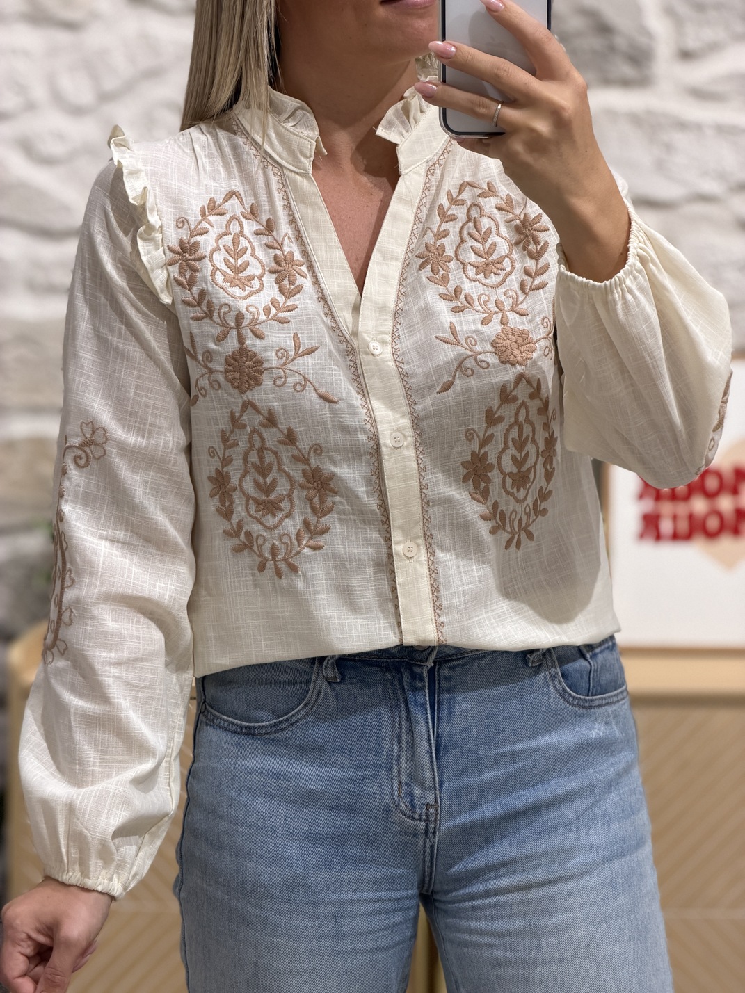Blouse THOMAS – Écrue Blouse Couleur : écru & chocolat Manches longues Motif fleuri au niveau du col et sur les manches Col V Boutons Tailles = S,M,L Longueurs = S : 59 cm, M : 60 cm, L : 61 cm Largeurs sous aisselles = S : 47 cm, M : 49 cm, L : 51 cm Composition : 100% coton Le modèle porte du S/M et mesure 1m65 Accessoires portés par le mannequin : Basket GASY