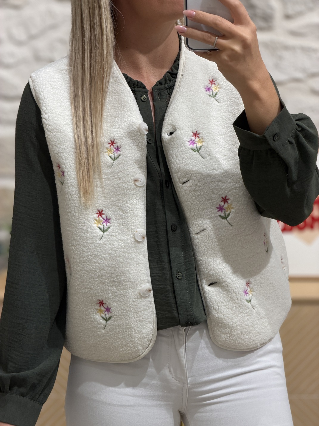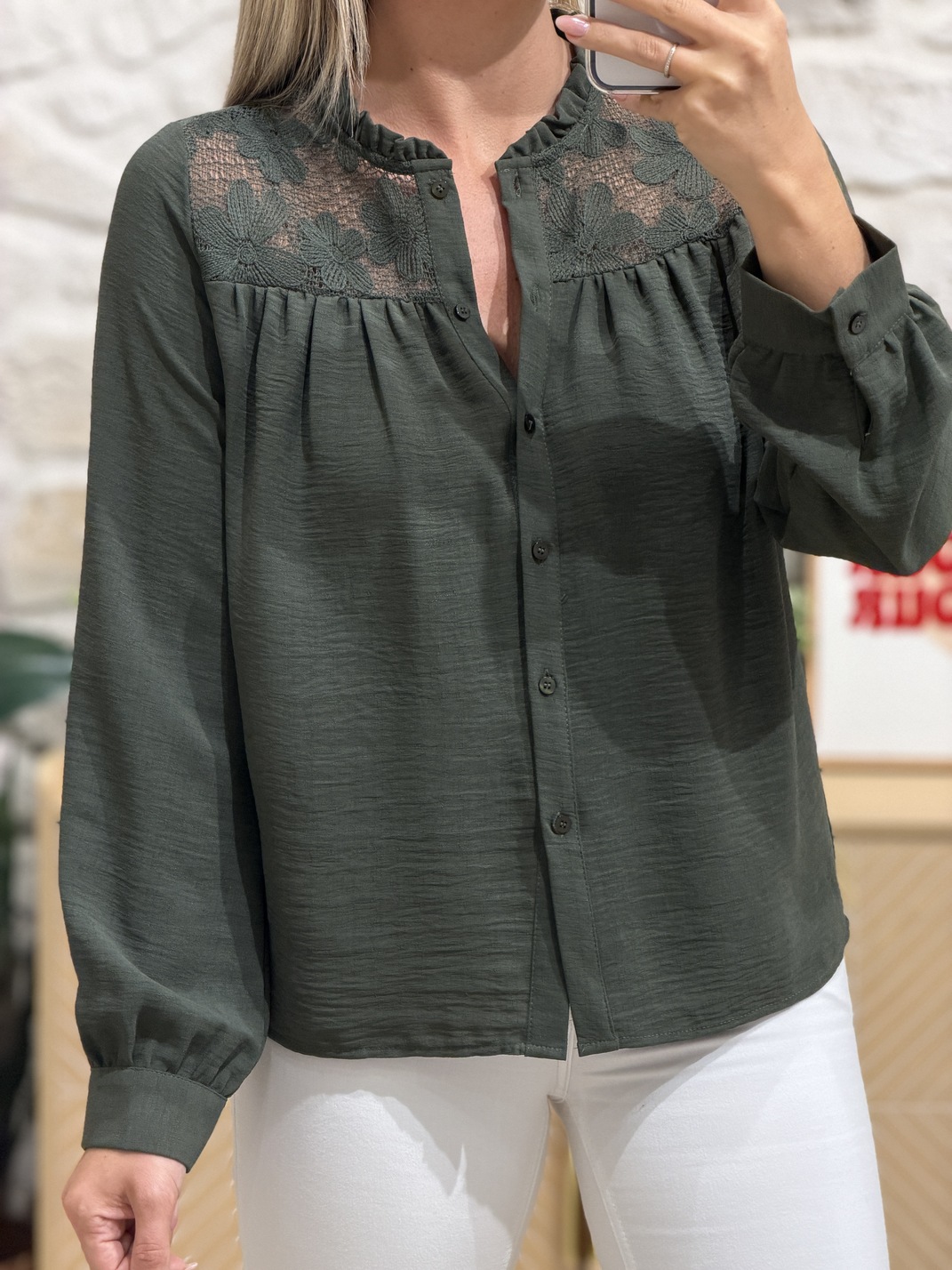 Blouse VANY – KAKI Blouse Couleur : kaki Manches longues Col montant festonné Fleurs ajourées au niveau du col Boutons Fluide Tailles = S : 36, M : 38, L : 40, XL : 42 Longueurs = S : 59 cm, M : 60 cm, L : 61 cm, XL : 62 cm Largeurs sous aisselles = S : 48 cm, M : 50 cm, L : 52 cm, XL : 54 cm Composition : 100% polyester Le modèle porte du S et mesure 1m65 Accessoires portés par le mannequin : Jean’s NICKY Blanc, Gilet sans manches JALYCIA