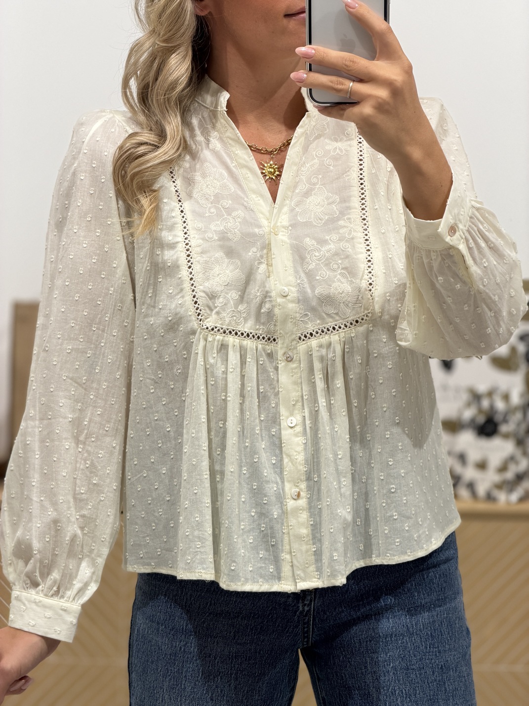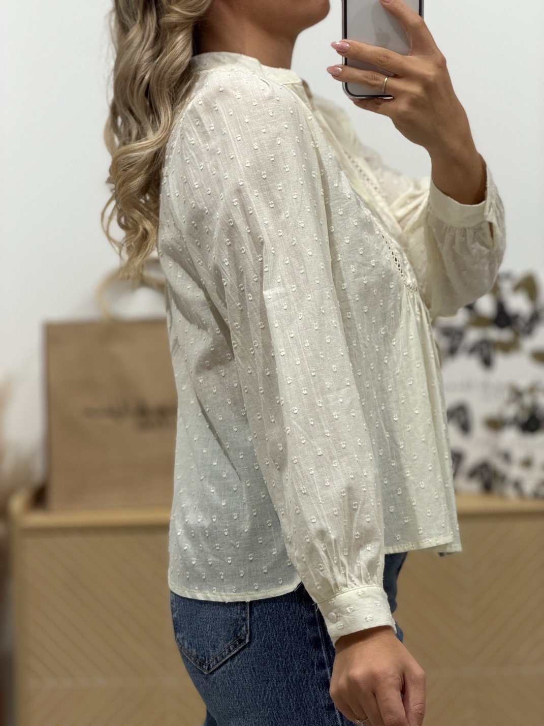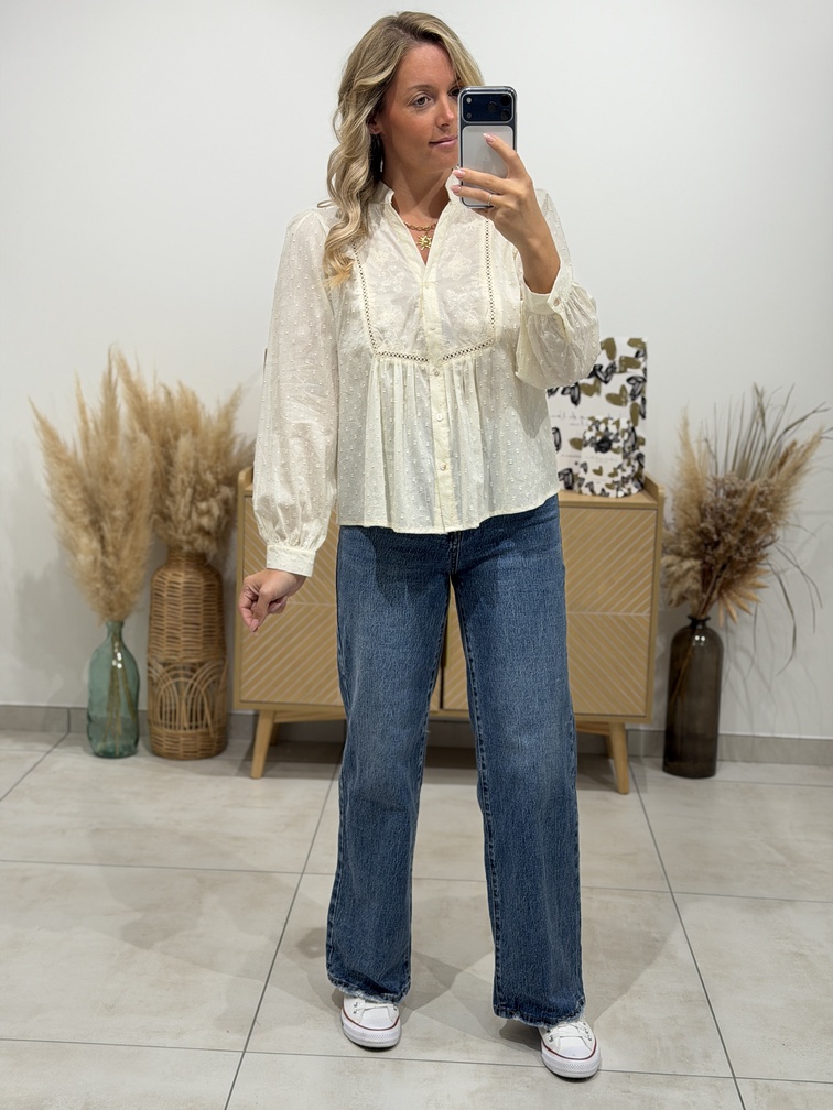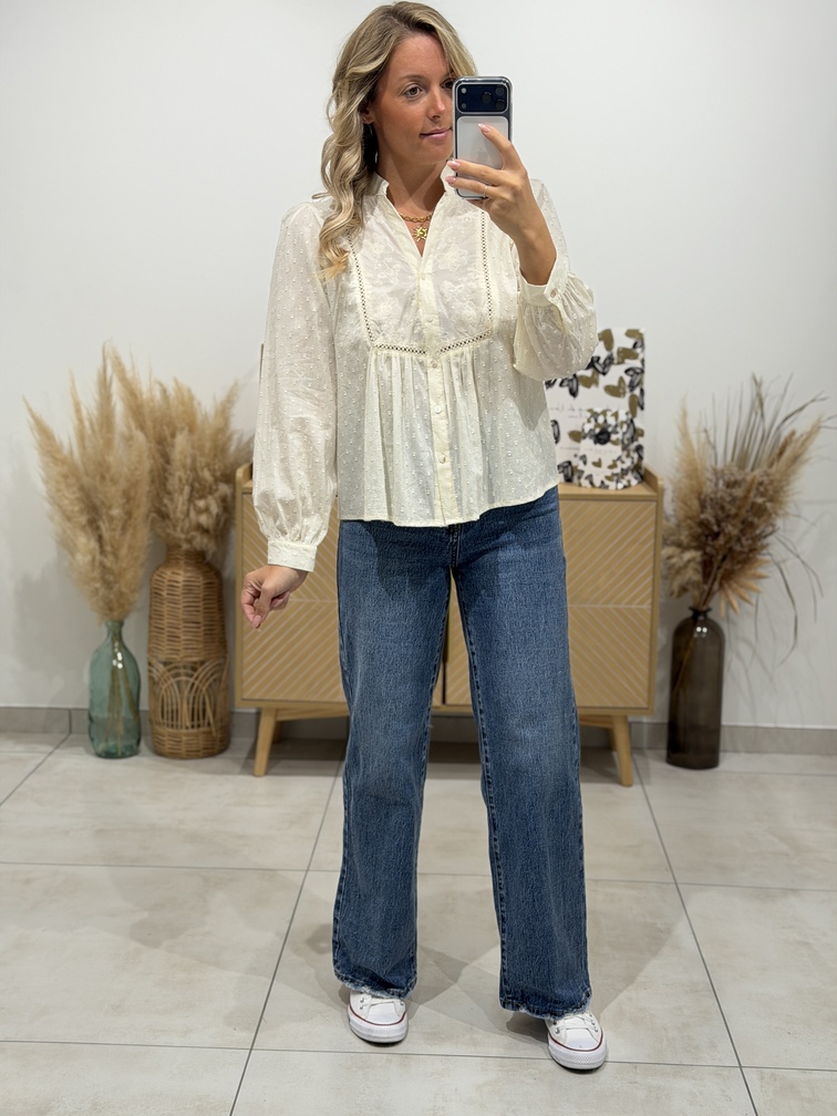 Blouse XILO Blouse Couleur : écrue Manches longue Col légèrement en V Boutons Pois texturés Tailles = S : 36, M : 38, L : 40, XL : 42 Longueurs = S : 57 cm, M : 58 cm, L : 59 cm, XL : 60 cm Largeurs sous aisselles = S : 51 cm, M : 53 cm, L : 55 cm, XL : 57 cm Composition : 100% coton Le modèle porte du S et mesure 1m65 Accessoires portés par le mannequin : Jean’s COREY