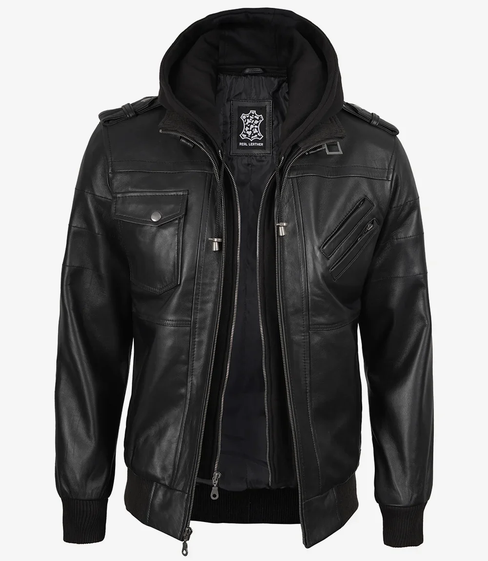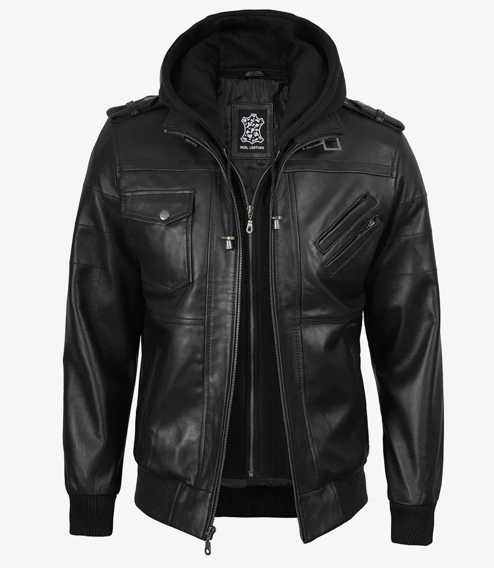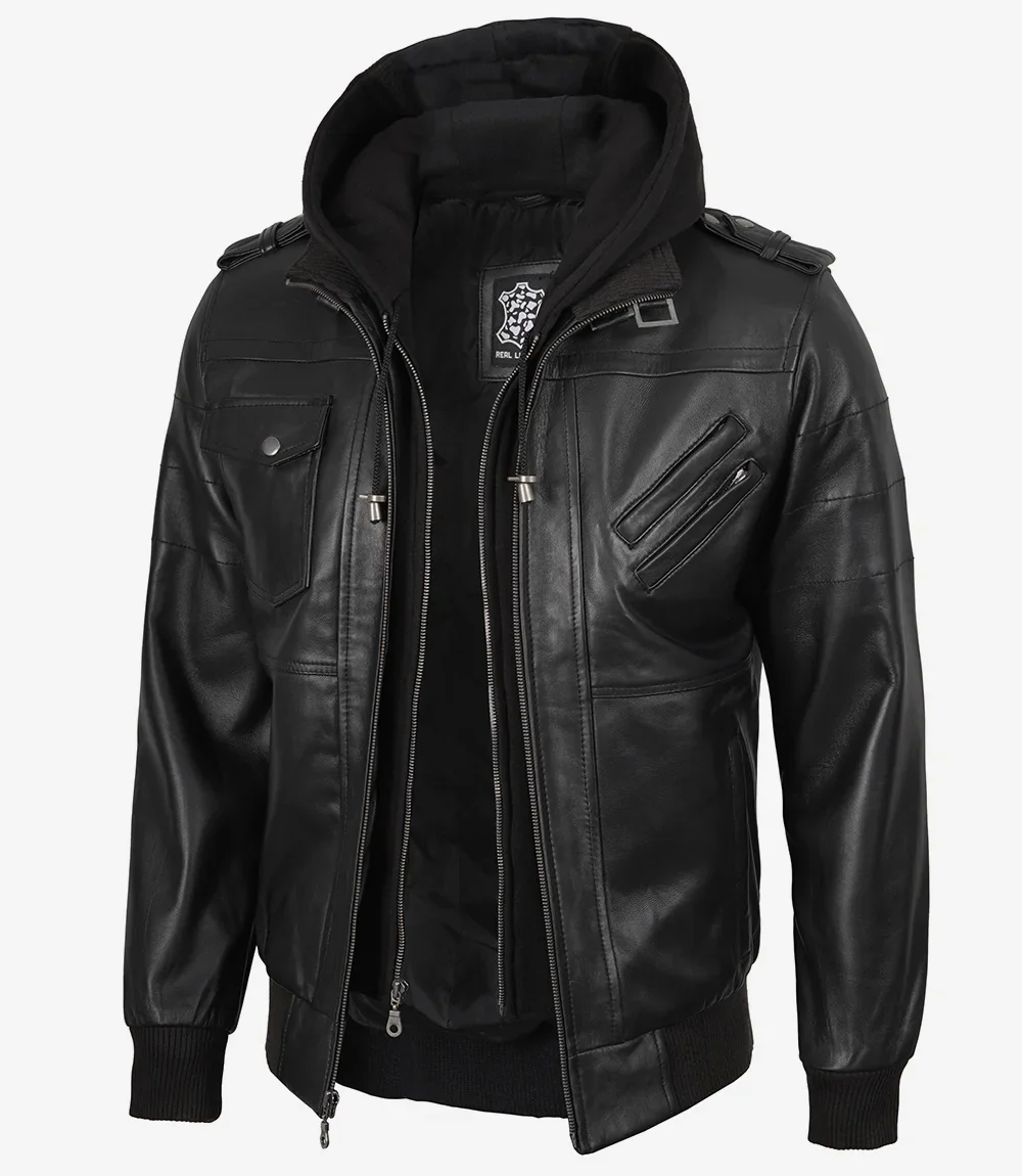 Blouson aviateur en cuir noir pour homme avec capuche amovible