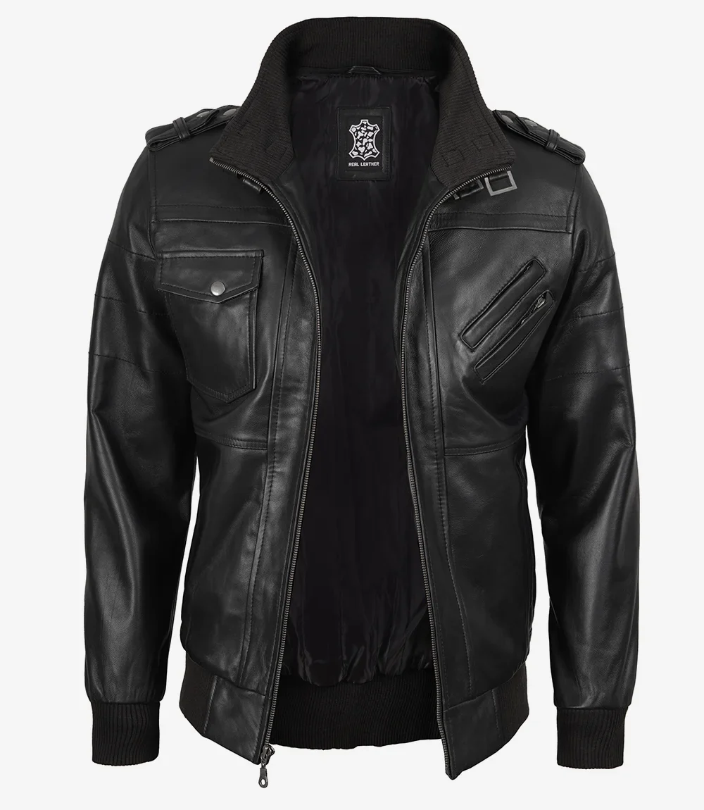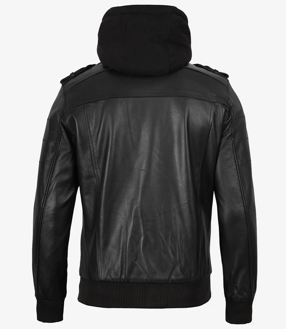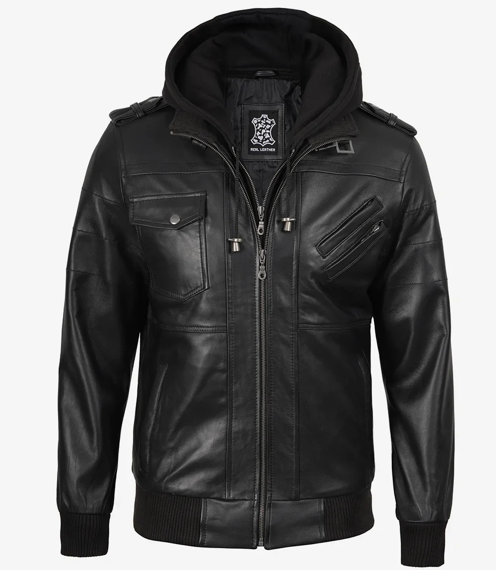 Blouson aviateur en cuir noir pour homme avec capuche amovible
