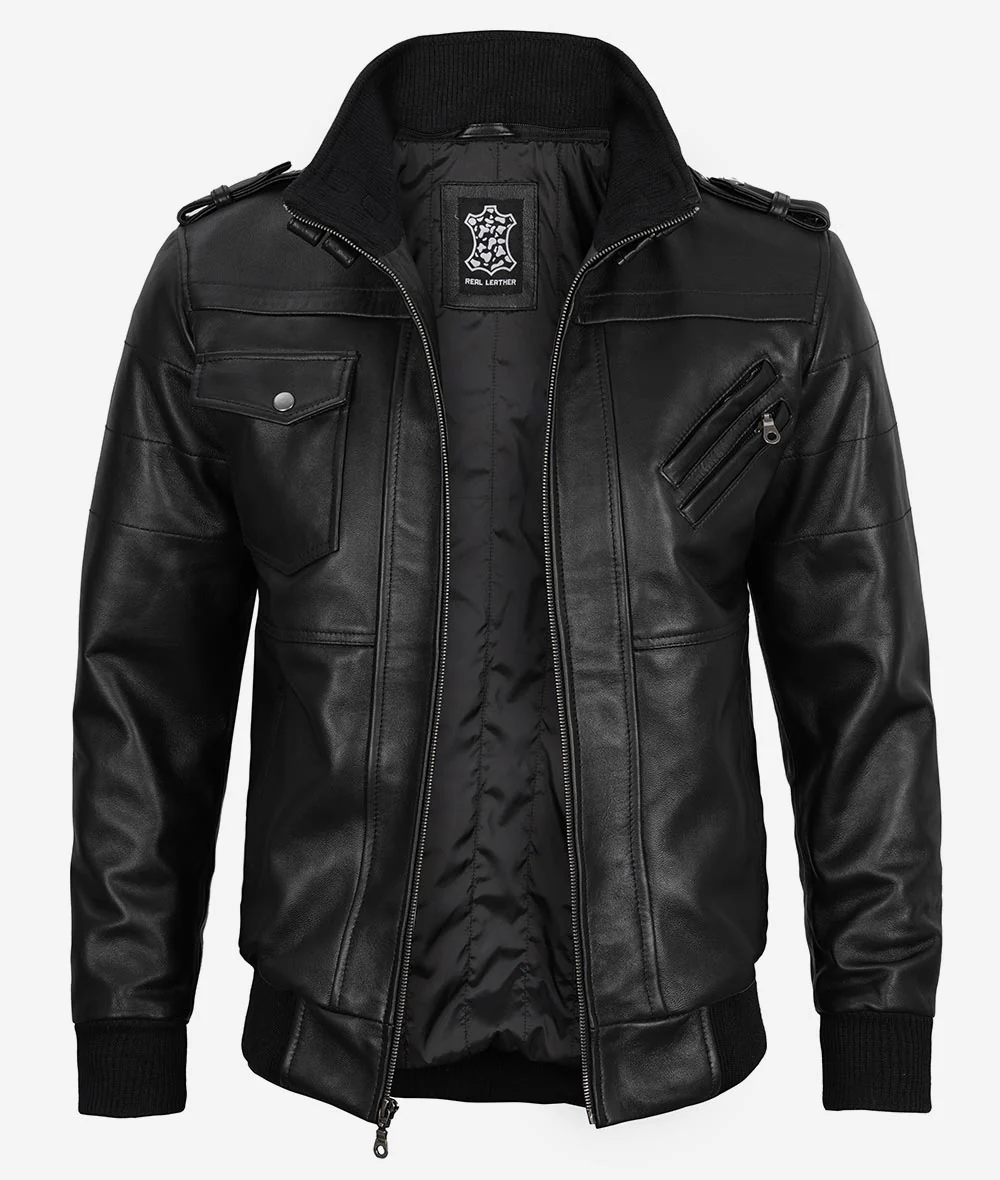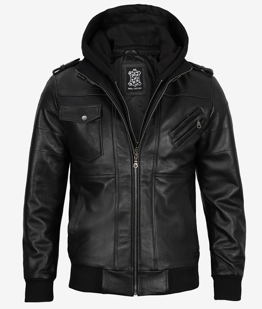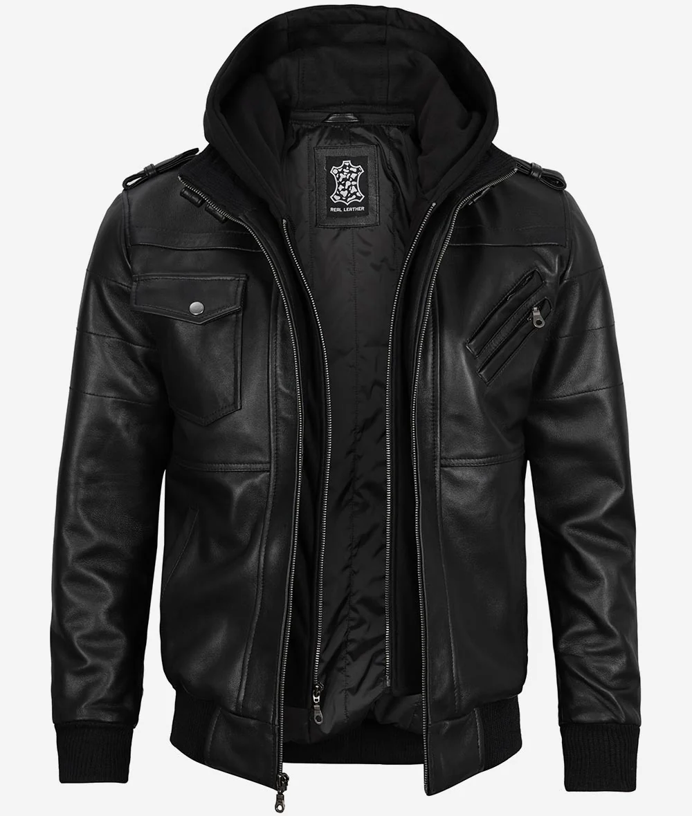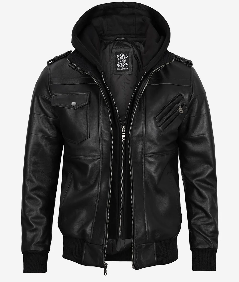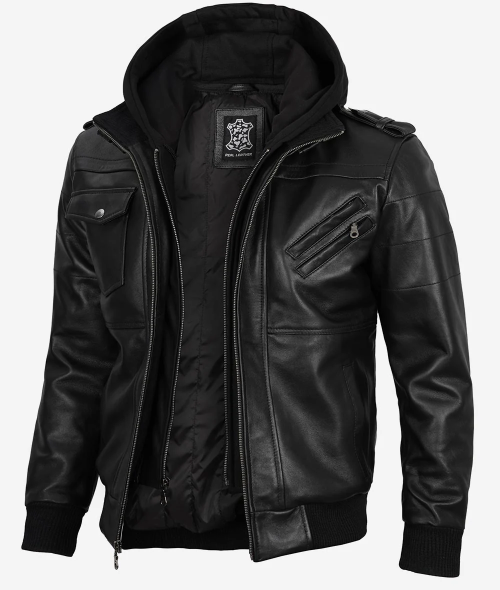 Blouson aviateur en cuir noir pour homme avec capuche amovible