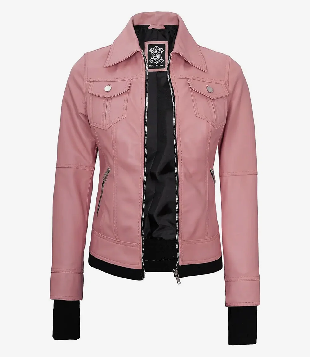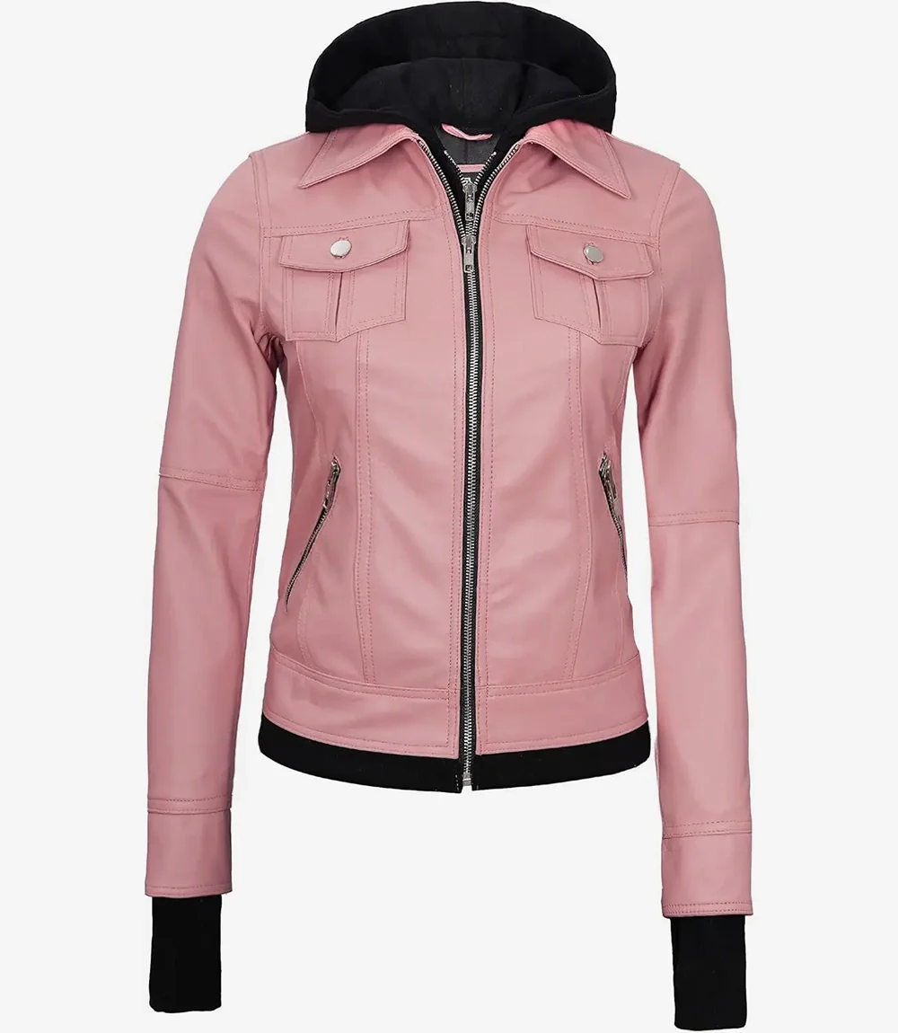 Blouson aviateur en cuir rose pour femme avec capuche amovible