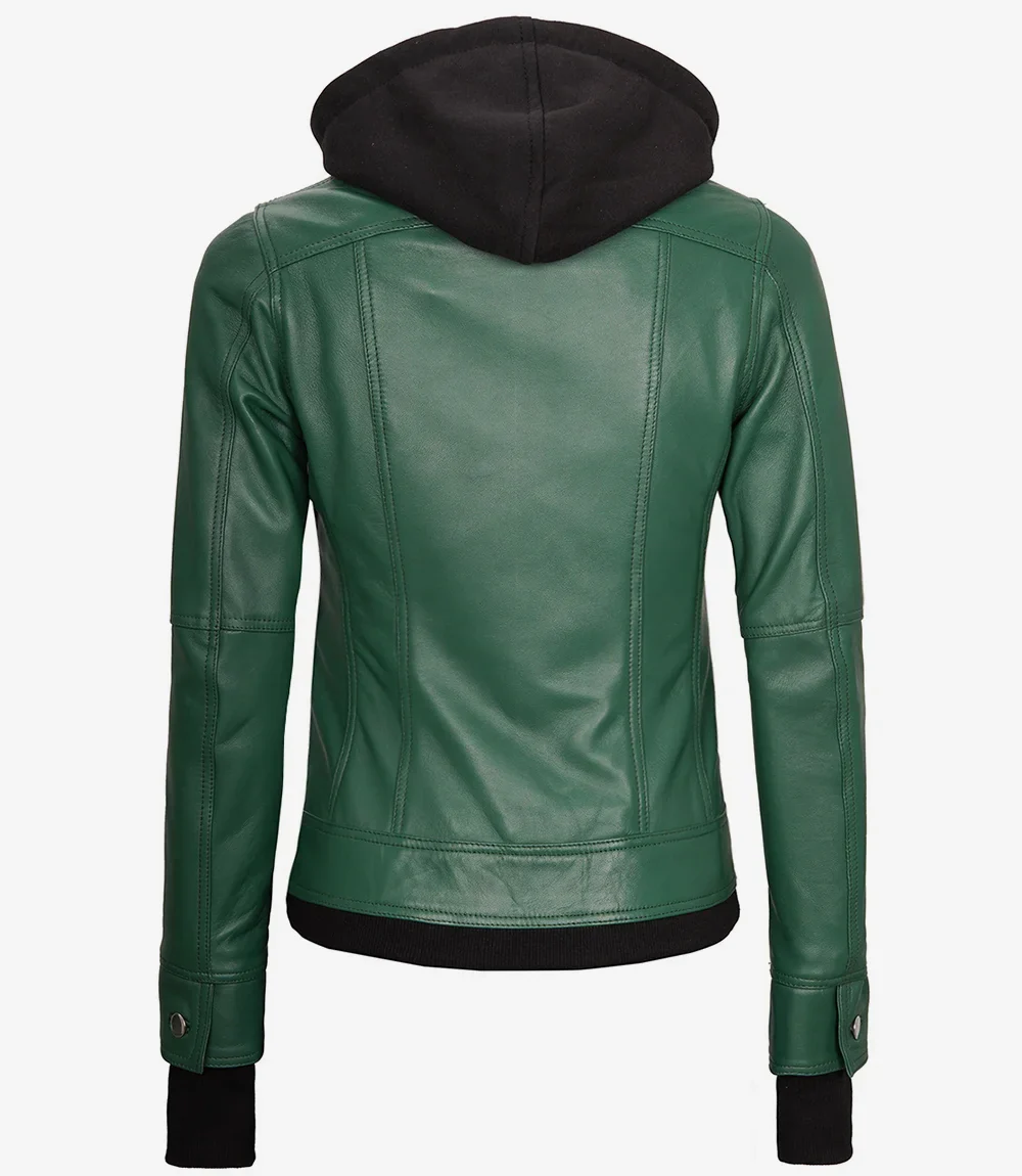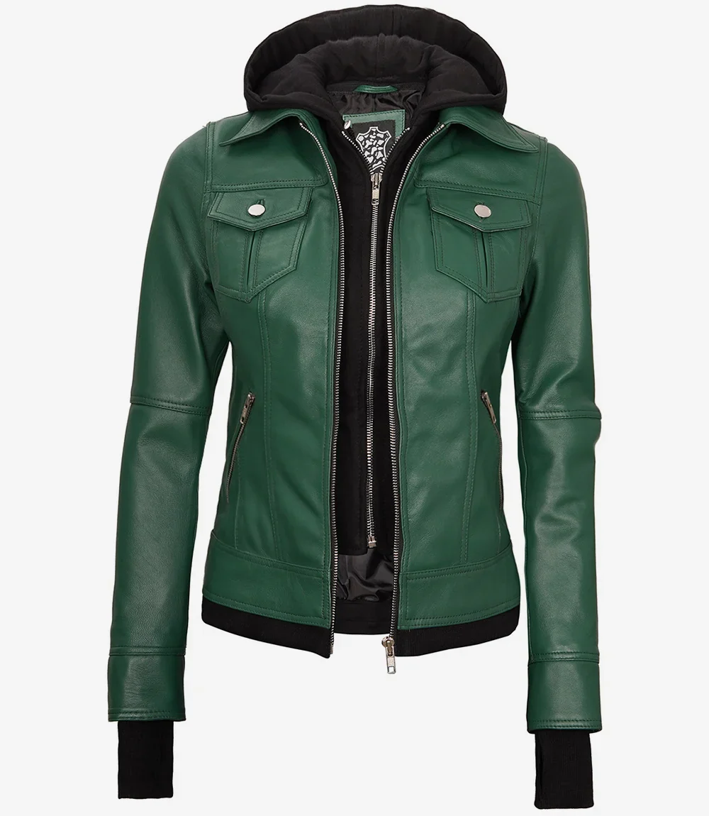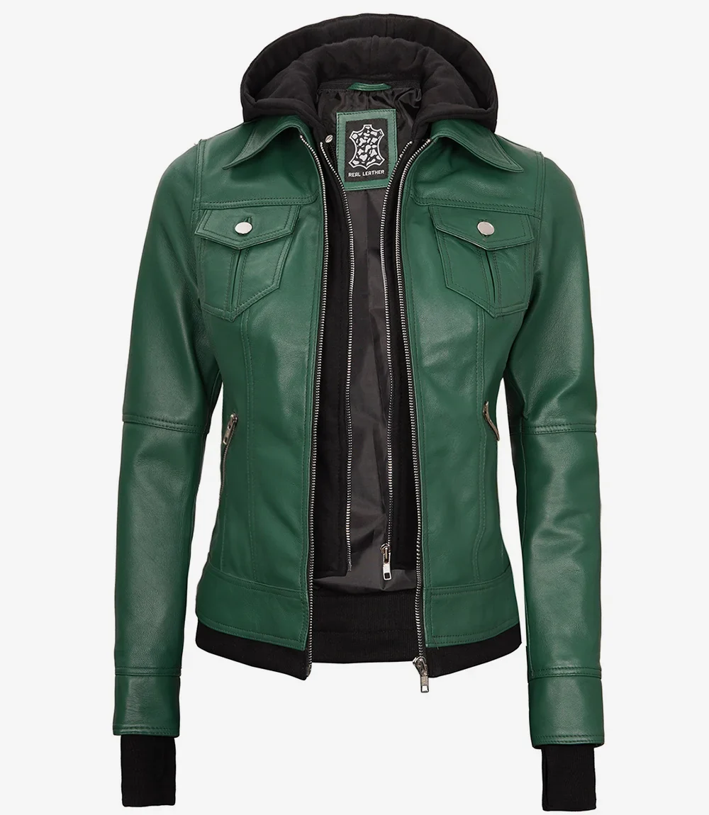 Blouson aviateur en cuir vert pour femme avec capuche amovible