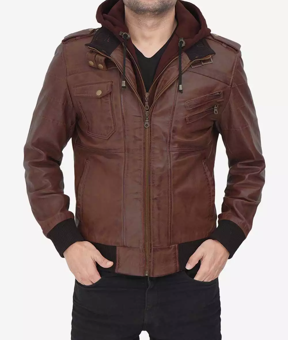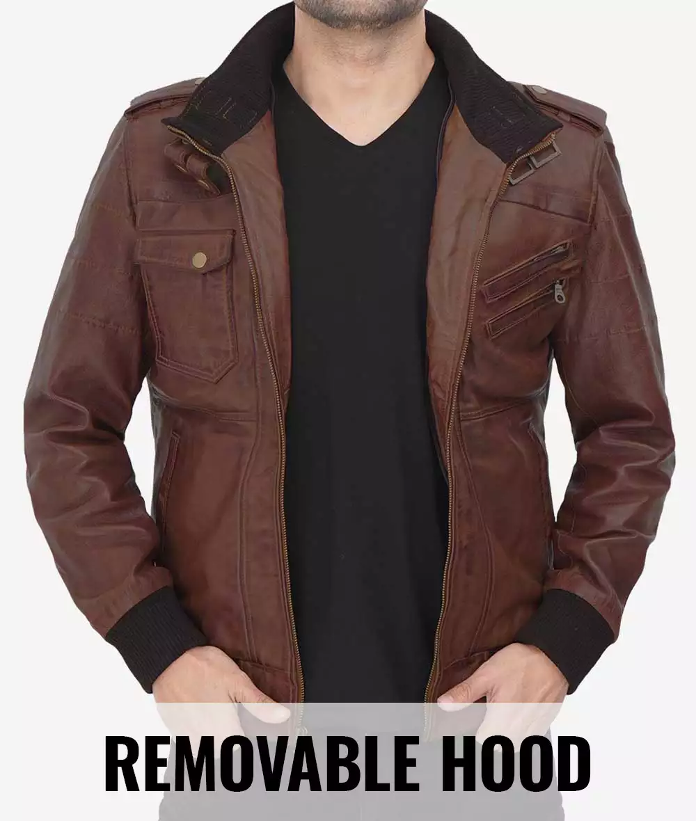 Blouson bomber en cuir marron foncé pour homme avec capuche amovible