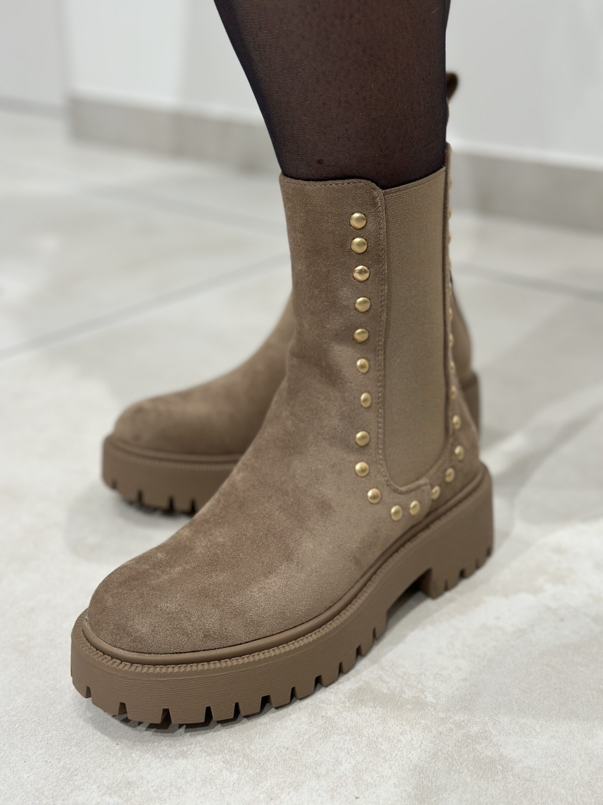 Bottines NITA – Taupe Bottines Couleur : taupe Effet daim Clous Semelle épaisse Petit talons ( 5 cm ) Disponible du 36 au 41 Prendre sa taille