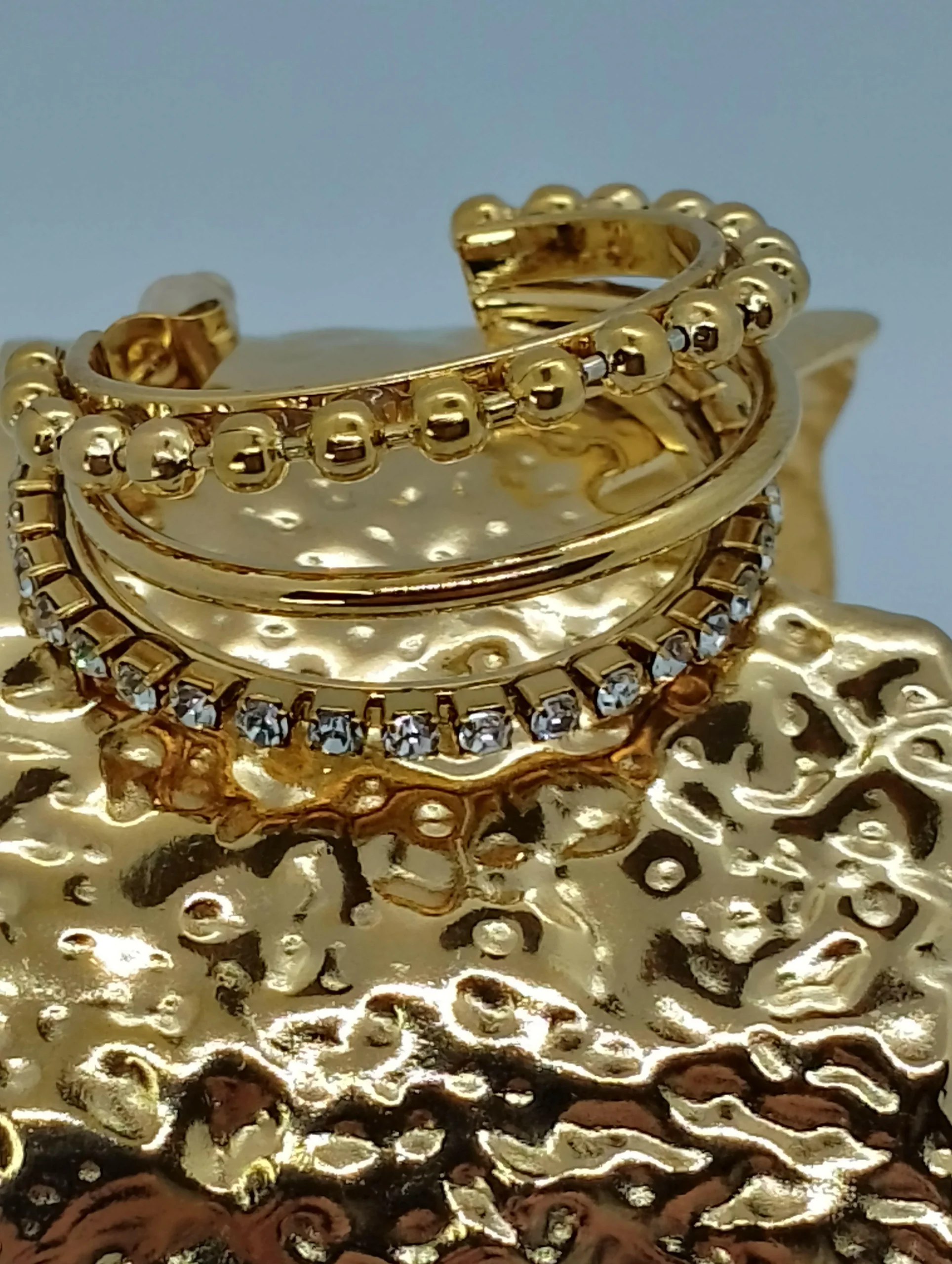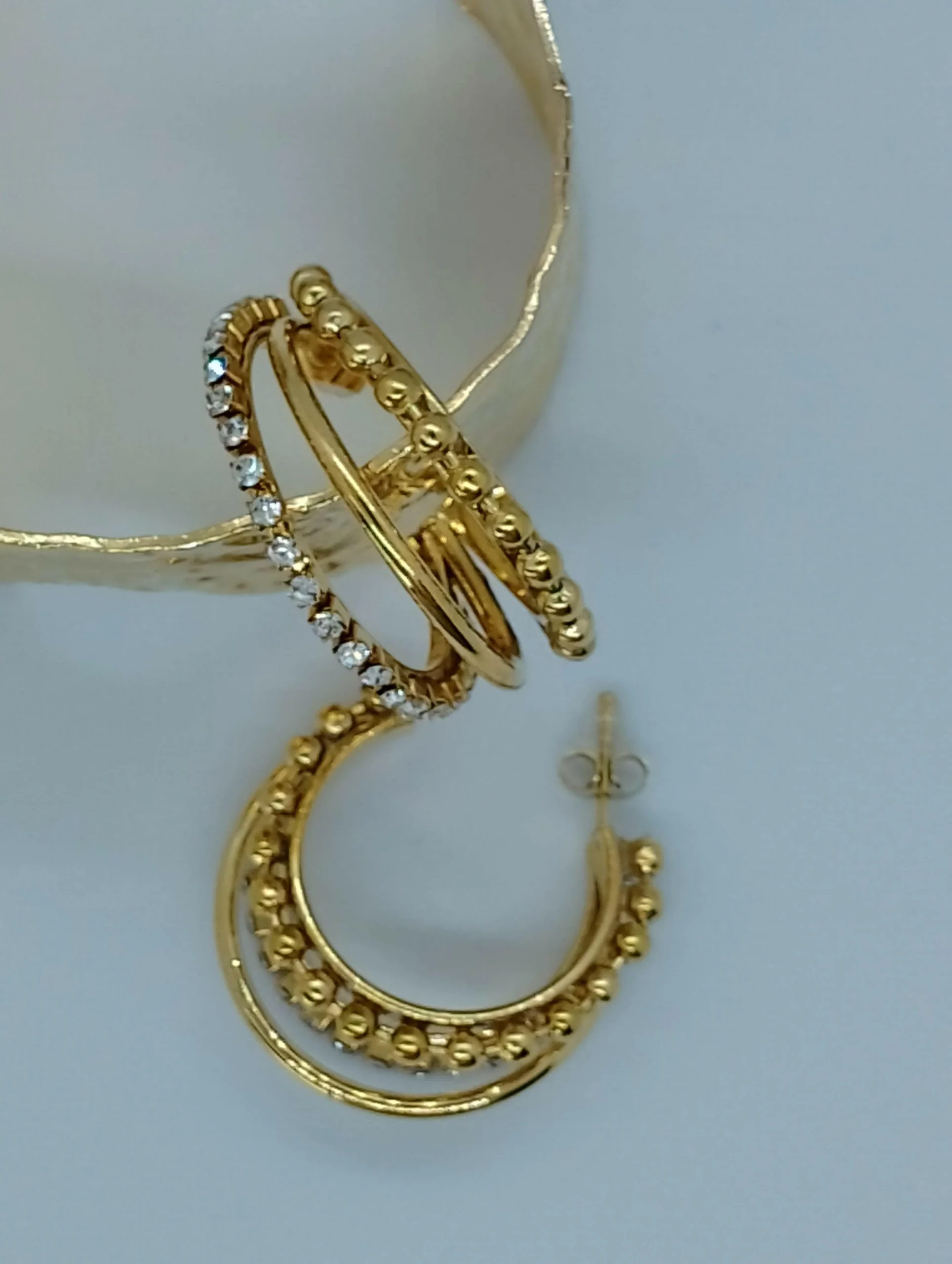 Les Boucles Alexandra sont des boucles d’oreilles en acier inoxydable, sans nickel et de couleur dorée, composées de petits strass. Les 3 demi-joncs de ce bijou le rendent unique : un de petits strass, un lisse et un formé de petites boules fantaisies.