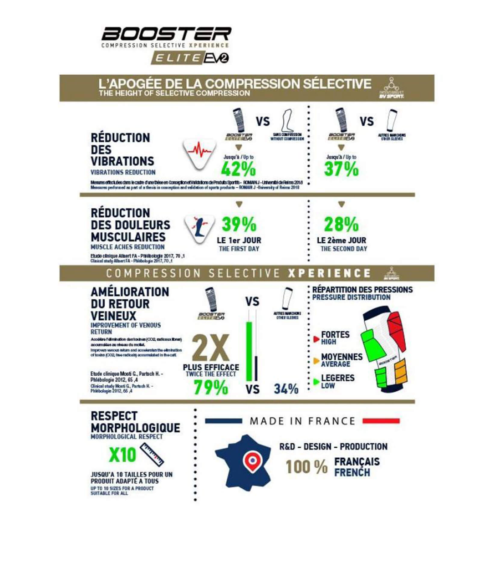 Porté régulièrement, le Booster Elite Evo2 repousse le phénomène de jambes lourdes, recule le seuil de fatigue, diminue les courbatures, réduit considérablement le risque de blessure et de lésion musculaire, et prépare à la récupération dès le début de l’effort.