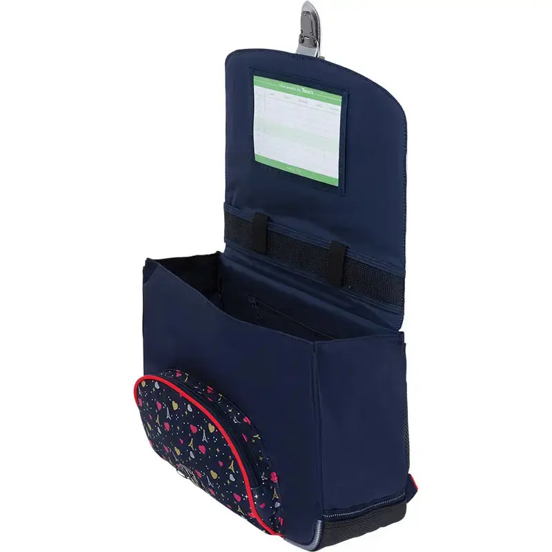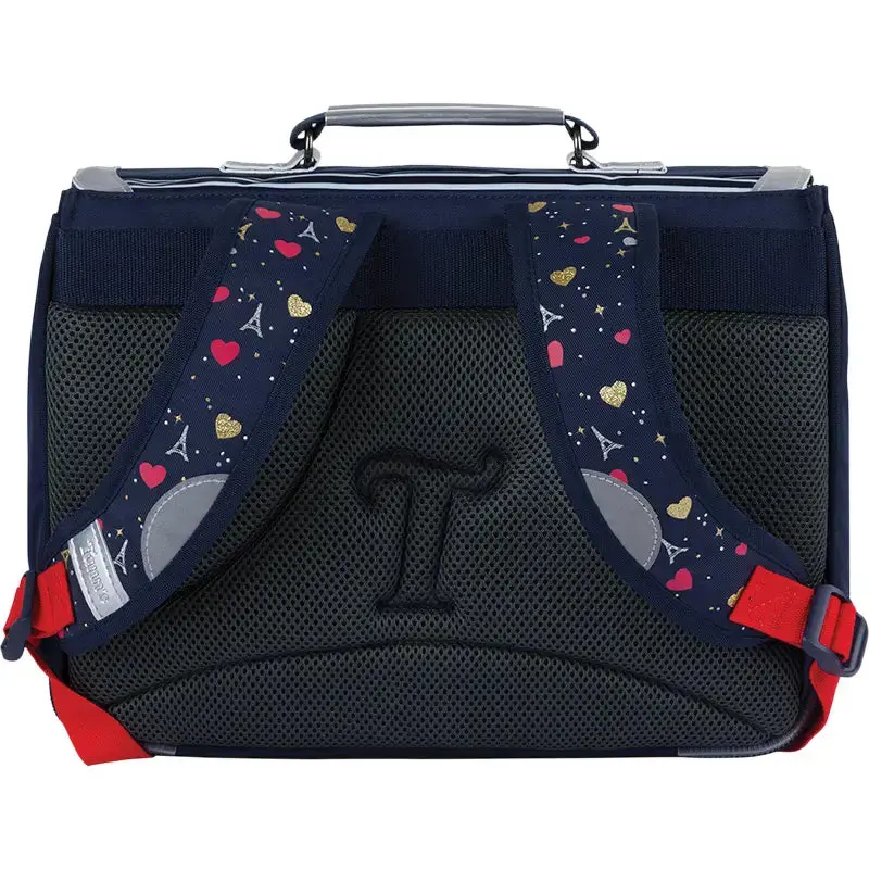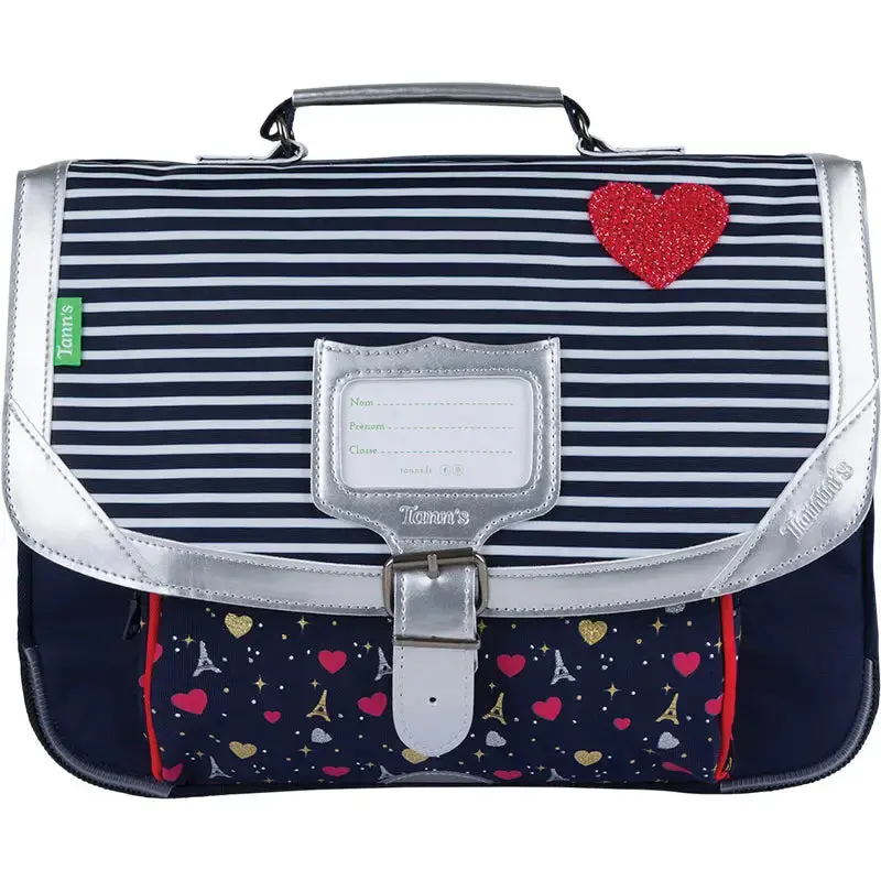 Le Cartable Tann’s « Emilie » est conçu pour accompagner les **jeunes élèves du CP**, combinant **design élégant, confort et solidité**. Son motif rayé est sublimé par un **patch cœur en bouclette avec fil lurex**, ainsi qu’une **sérigraphie dorée et argentée sur la poche**, inspirée du **thème Paris**.