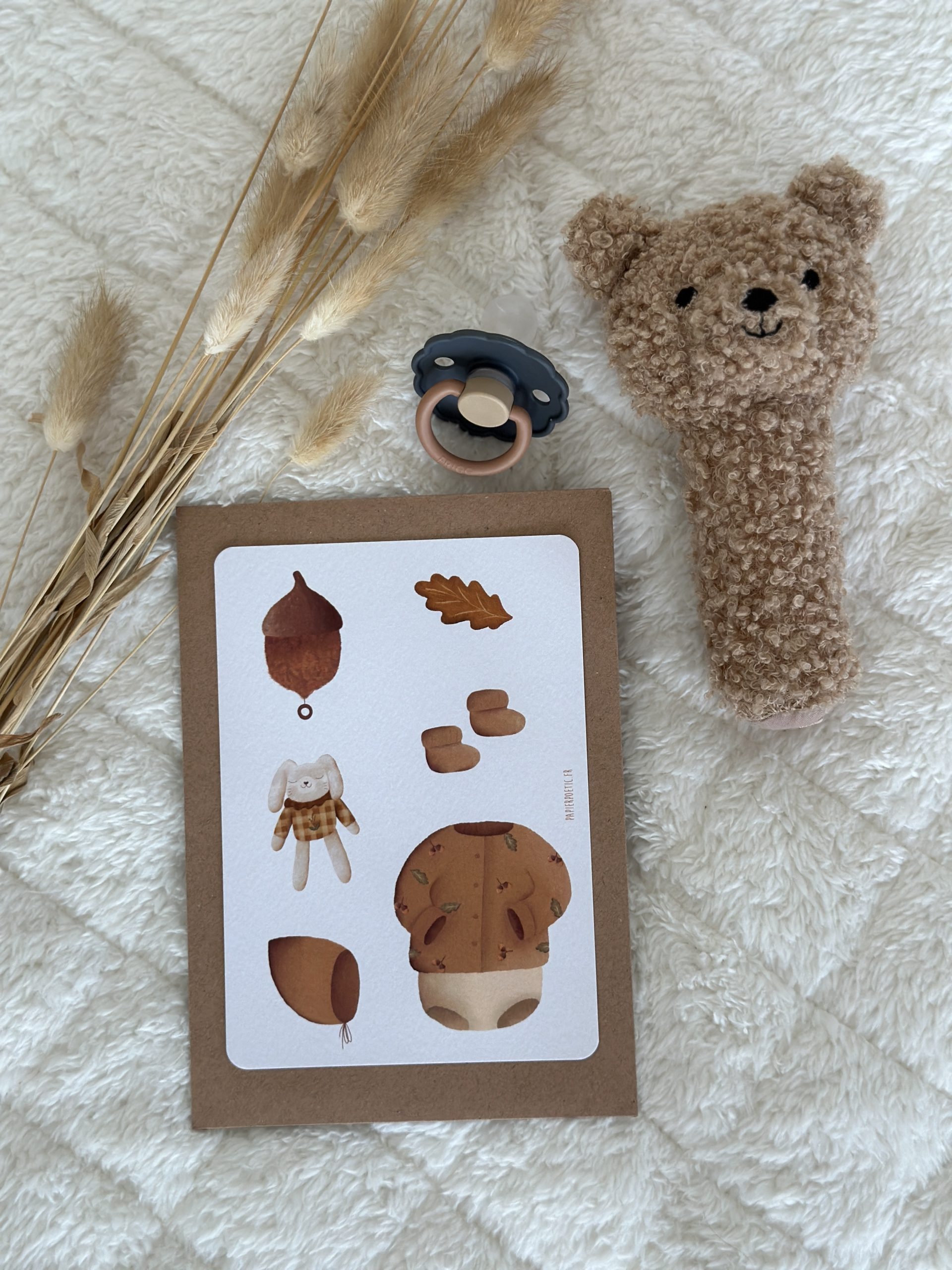 Carte “ Mes petites affaires ” automne Impression format A6, coins arrondis, sur papier texturé aquarelle 300g Livrée avec enveloppe recyclée kraft et pochette transparente
