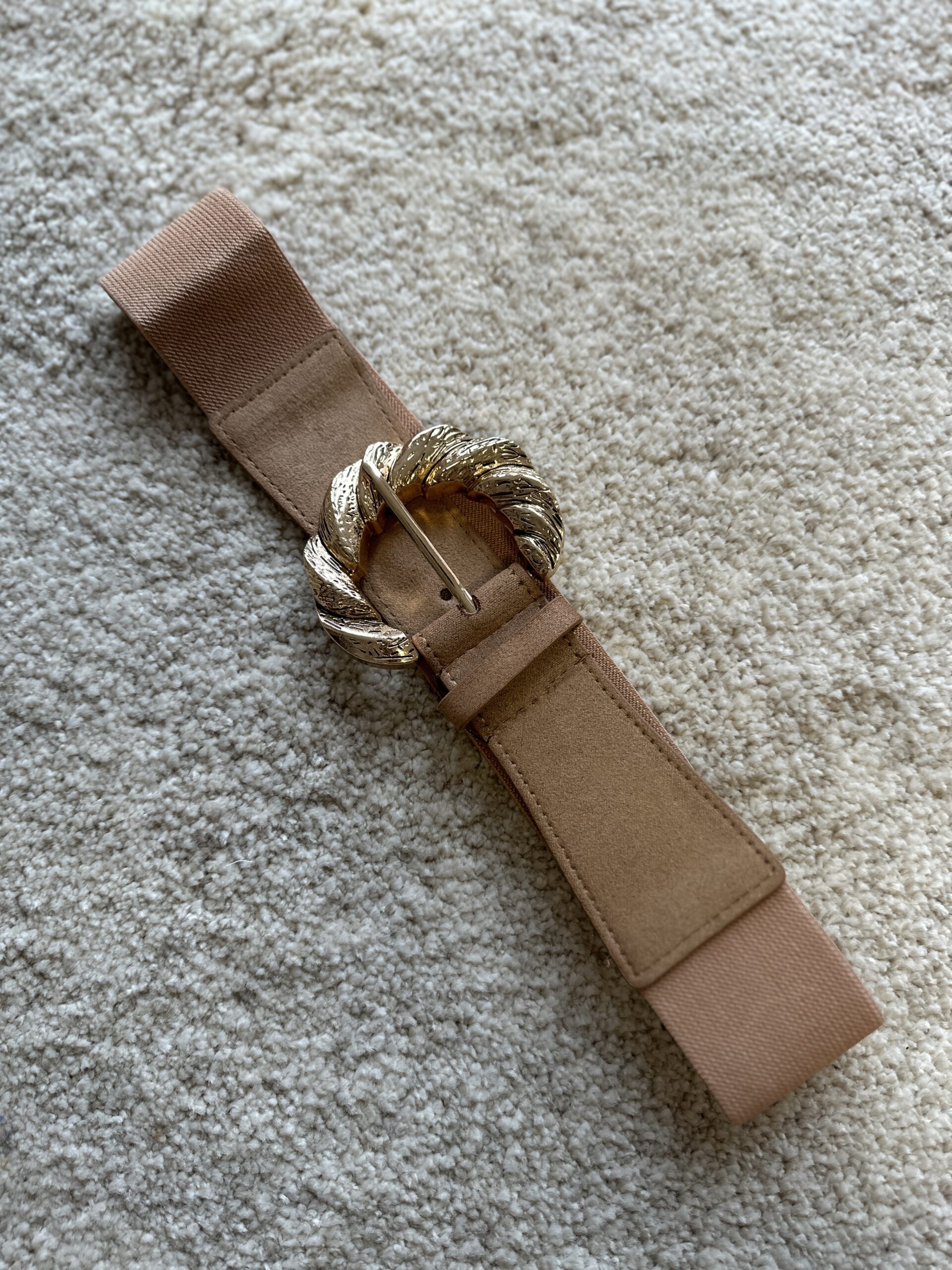 CEINTURE Demi boucle Beige foncé Boucle dorée Couleur : Beige foncé Réglable Extensible jusqu’à 110cm Effet raphia Taille boucle : 8 cm Largueur : 6 cm