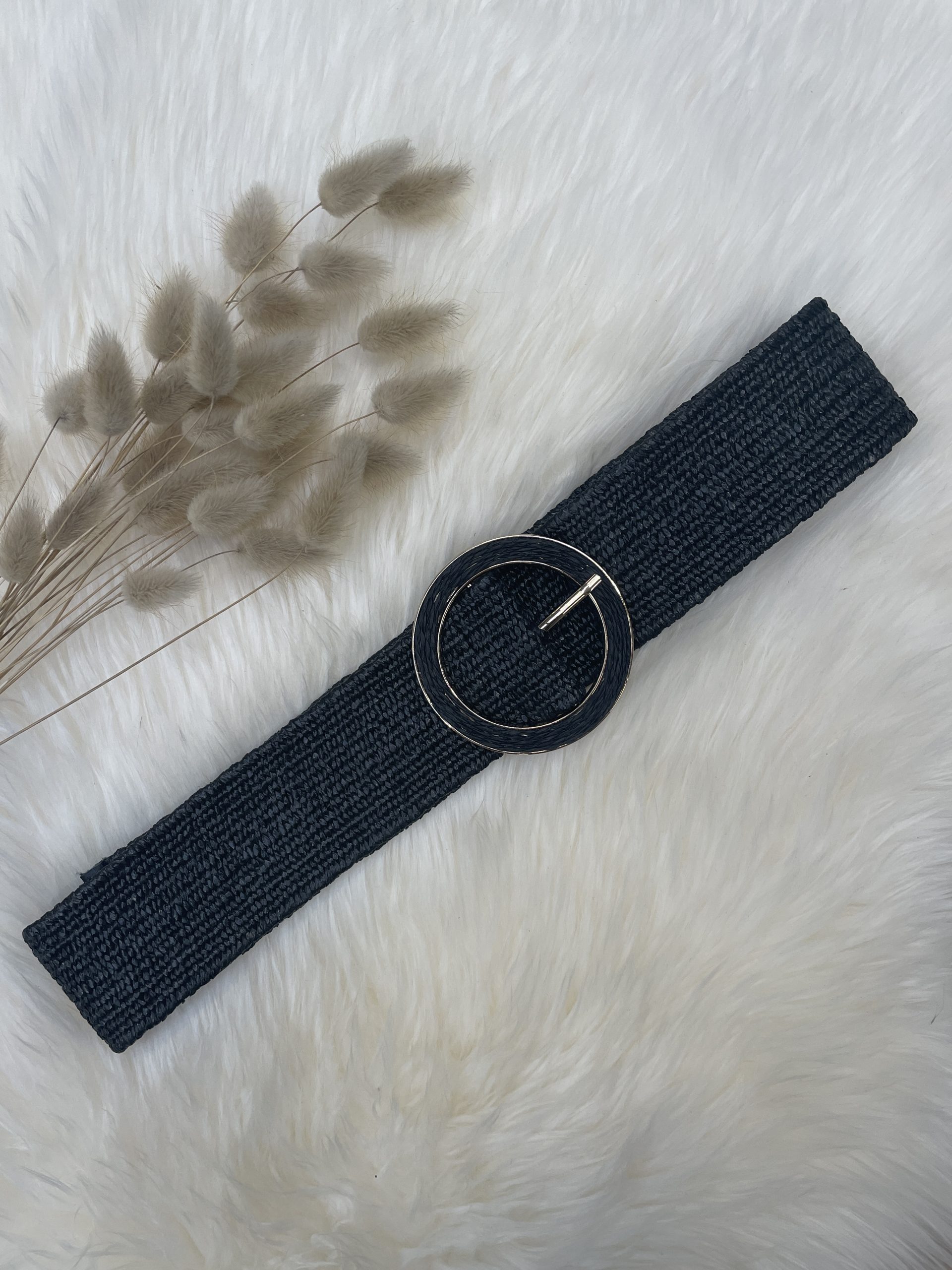 CEINTURE N*65 Noir Boucle dorée Couleur : Noir Réglable Extensible jusqu’à 110cm Effet raphia Taille boucle : 8 cm Largueur : 6 cm