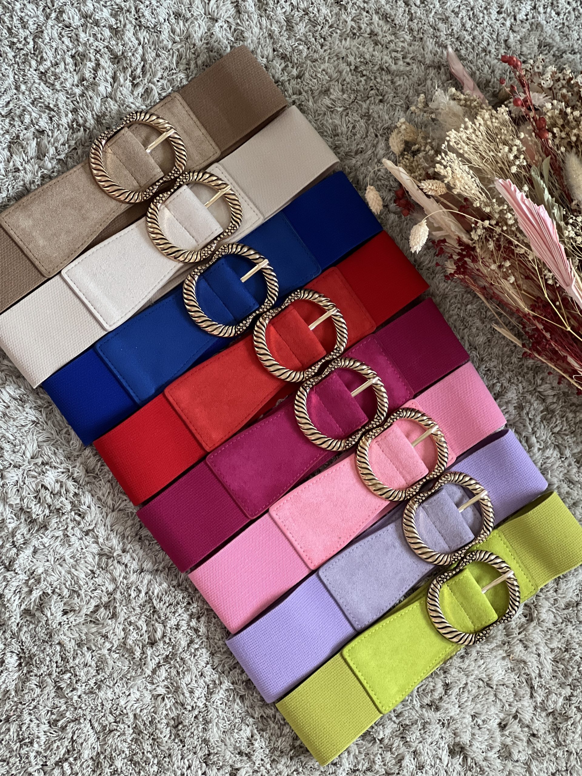 CEINTURE N*69 Boucle dorée Réglable Coloris : Beige foncé, beige clair, bleu roi, rouge, fuchsia, rose pétant, lilas, et pomme Extensible jusqu’à 110cm Taille boucle : 6 cm