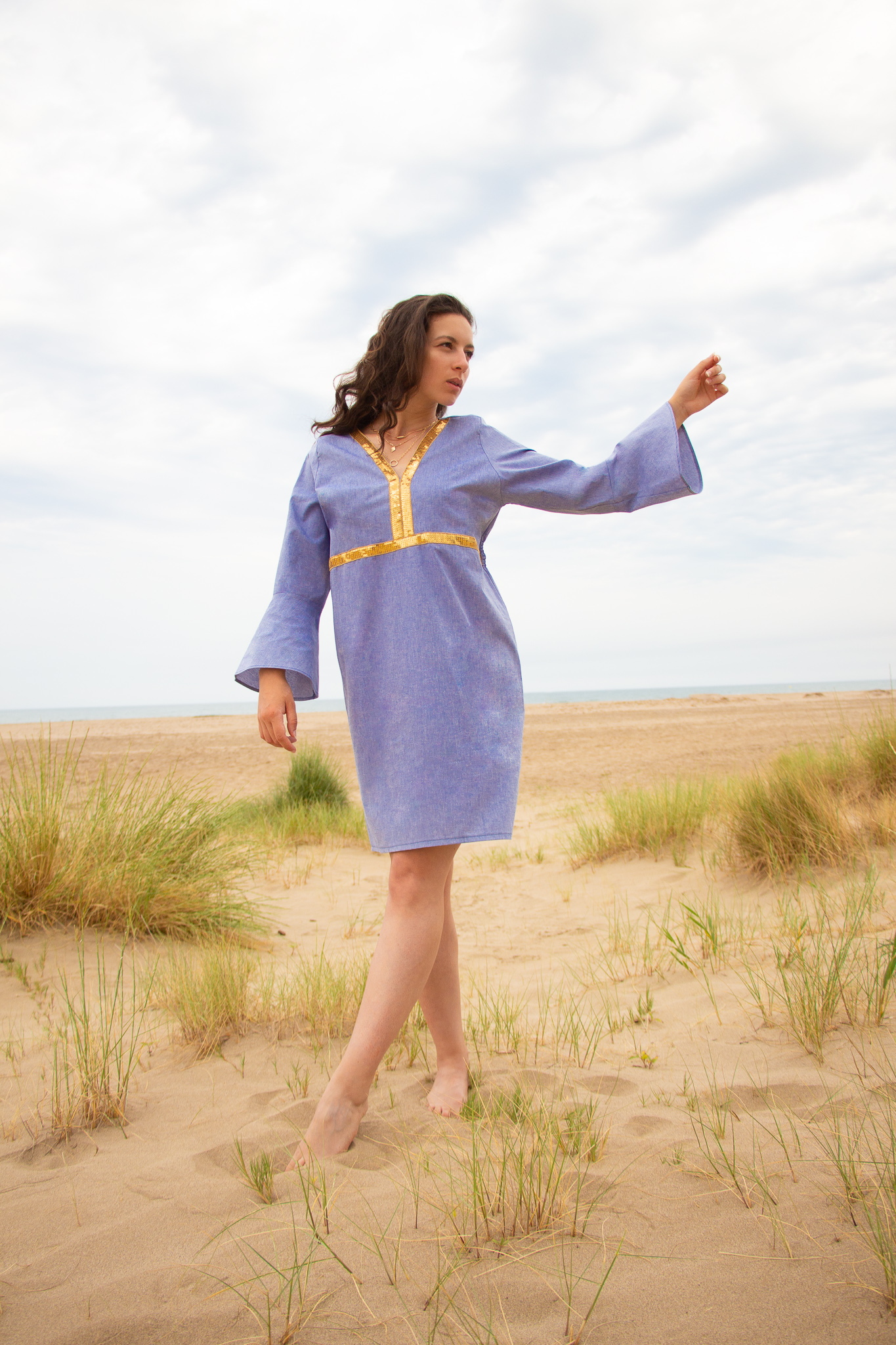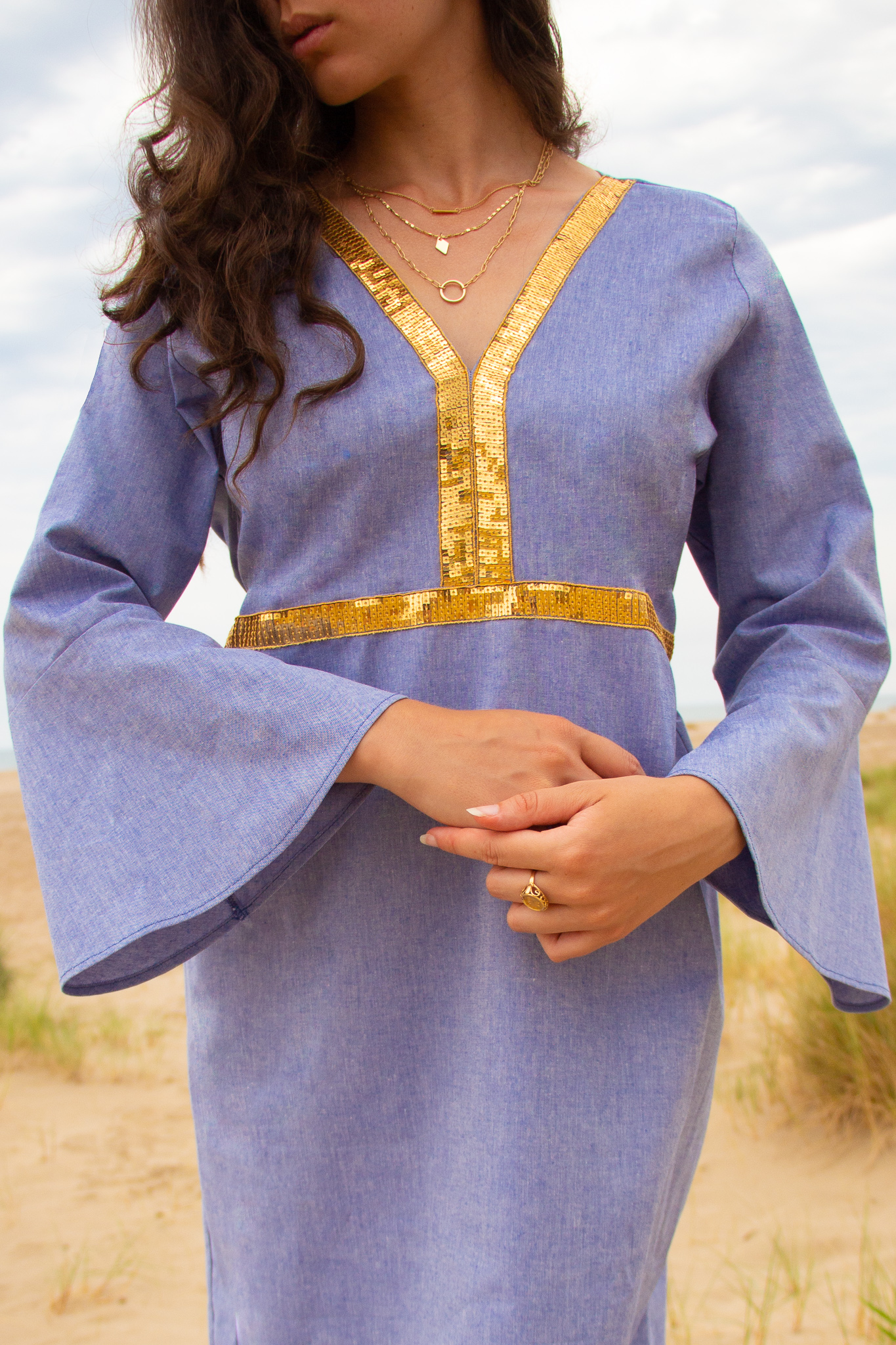 Une belle robe à sequins dorés ! Un magnifique coton bleu chambray de grande qualité Un décolleté V sublime Des manches trompette très tendance Une taille marquée et confortable grâce à plusieurs rangées de smocks dans le dos Une robe facile à porter, qui convient à toutes les morphologies