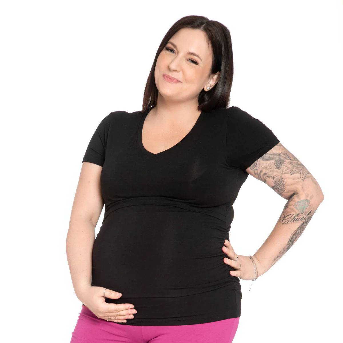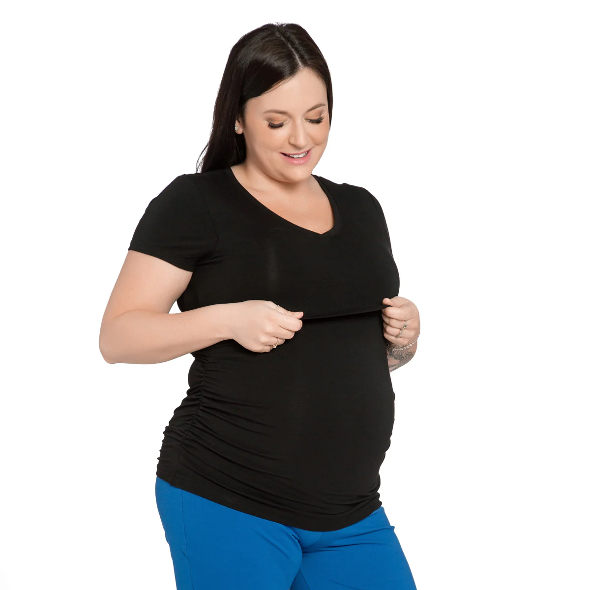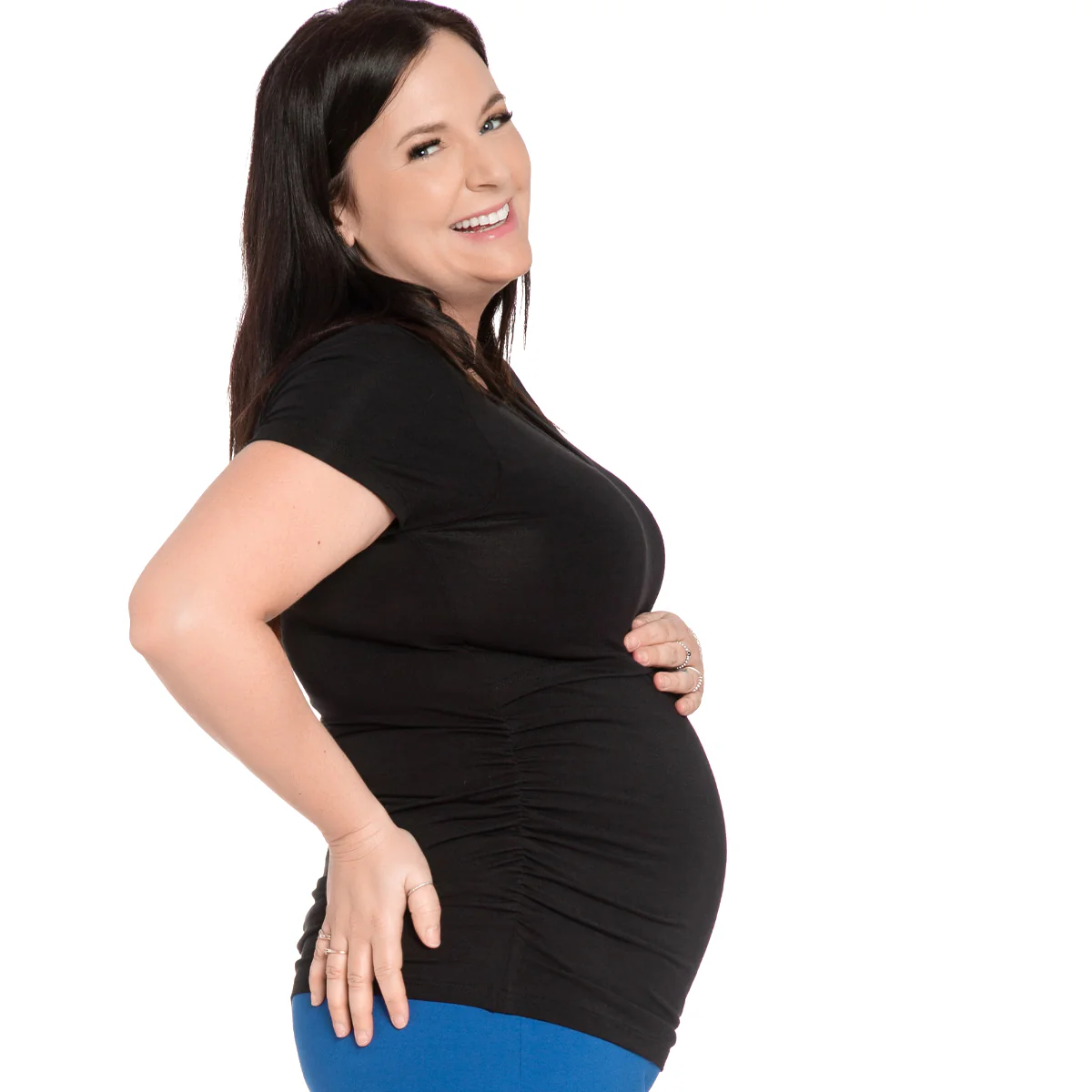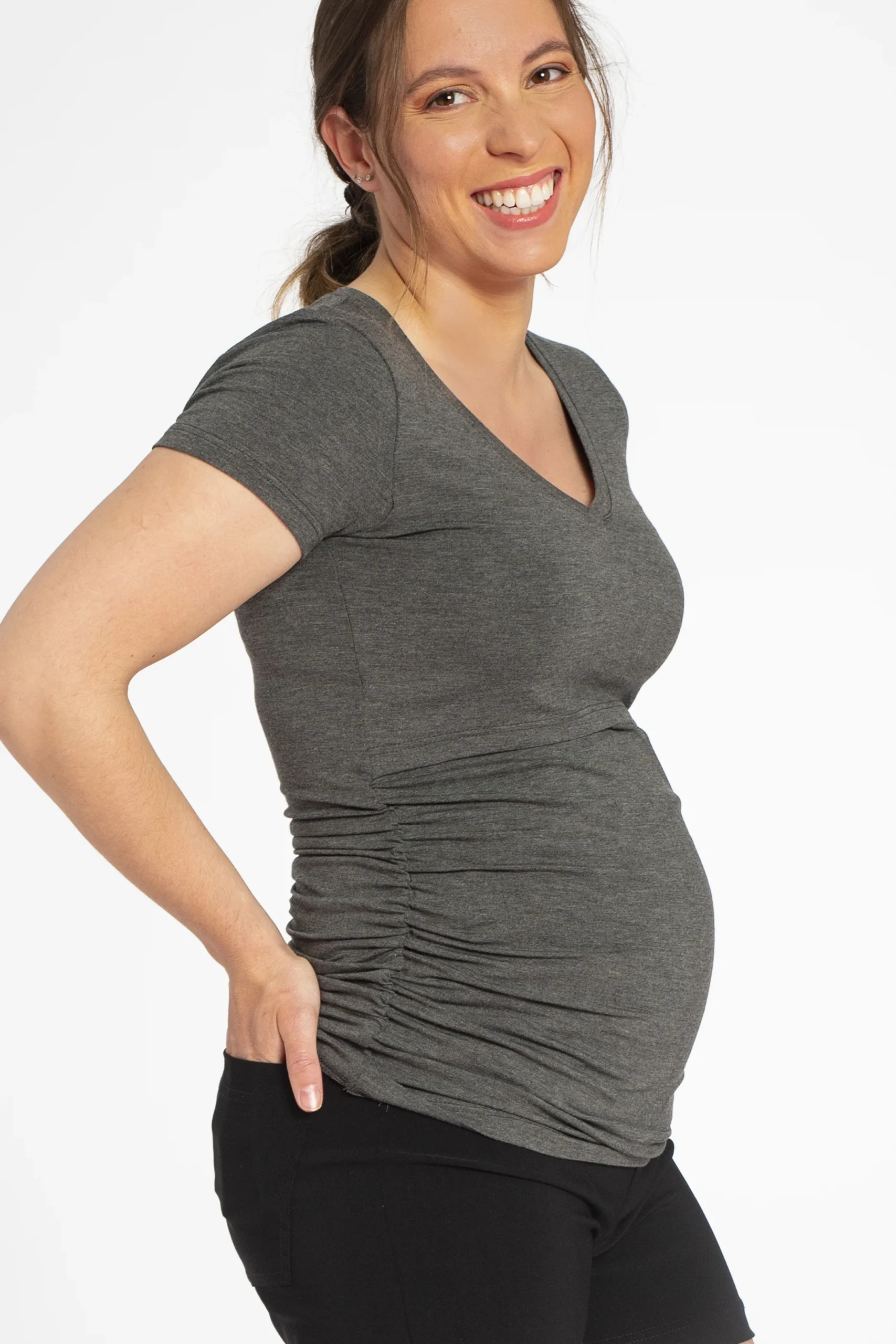Le chandail Corinne est un morceau essentiel et passe-partout qui vous suivra du début à la fin de votre grossesse ainsi que pendant l’allaitement. Fait d’un tissu doux et extensible, ce modèle mettra en valeur votre ventre de femme enceinte avec des fronces sur les côtés permettant au vêtement de s’ajuster à votre ventre.