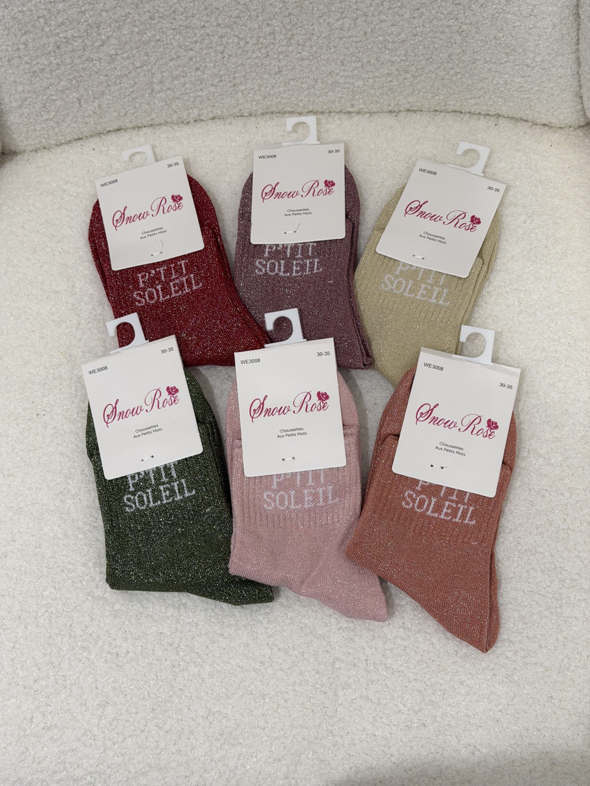 Chaussettes KIDS paillettes – P’TIT SOLEIL (Taille 30/35) Détail des couleurs sur la photo de description Paire de chaussettes à paillettes Coloris : vert, beige, vieux rose, bordeaux, mauve, rose clair Inscription : « p’tit soleil « Taille 30/35 Composition : 77% coton, 21% polyester, 2% spandex
