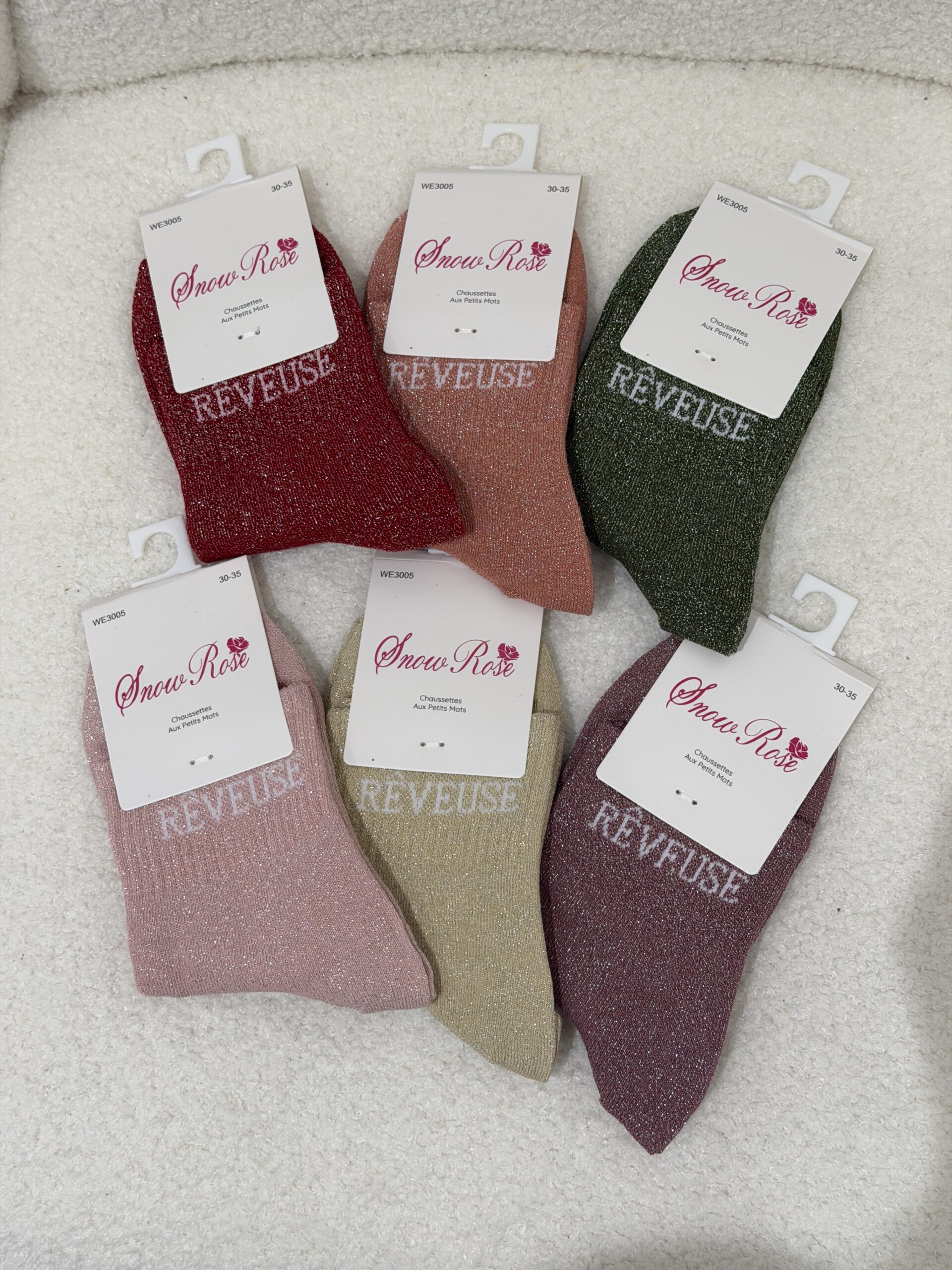Chaussettes KIDS paillettes – REVEUSE Détail des couleurs sur la photo de description Paire de chaussettes à paillettes Coloris : vert, beige, vieux rose, bordeaux, mauve, rose clair Inscription : « Reveuse « Taille 30/35 Composition : 77% coton, 21% polyester, 2% spandex