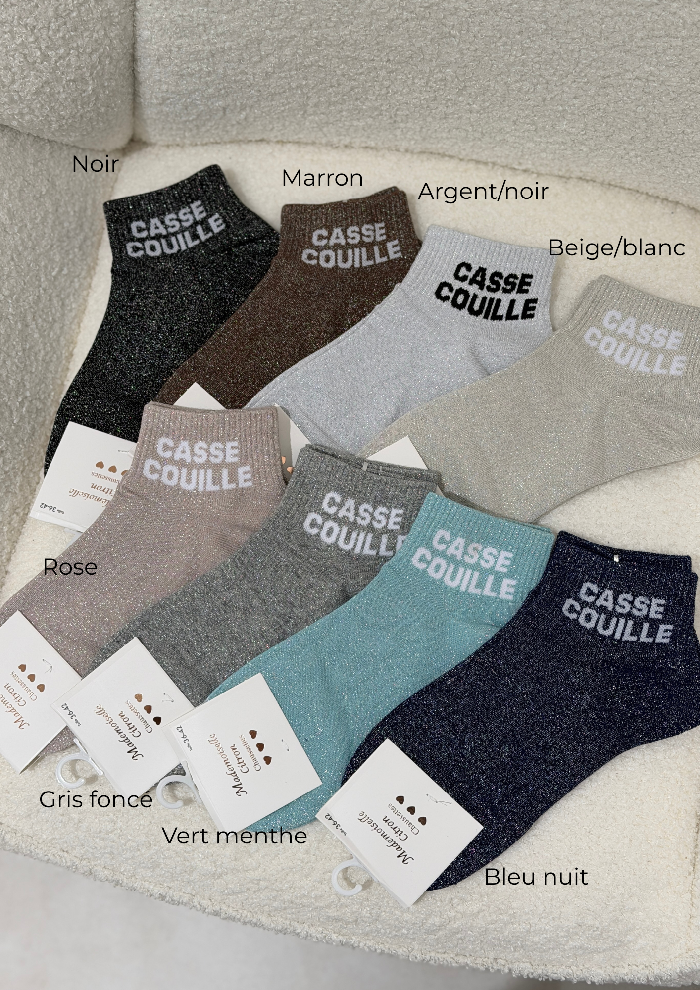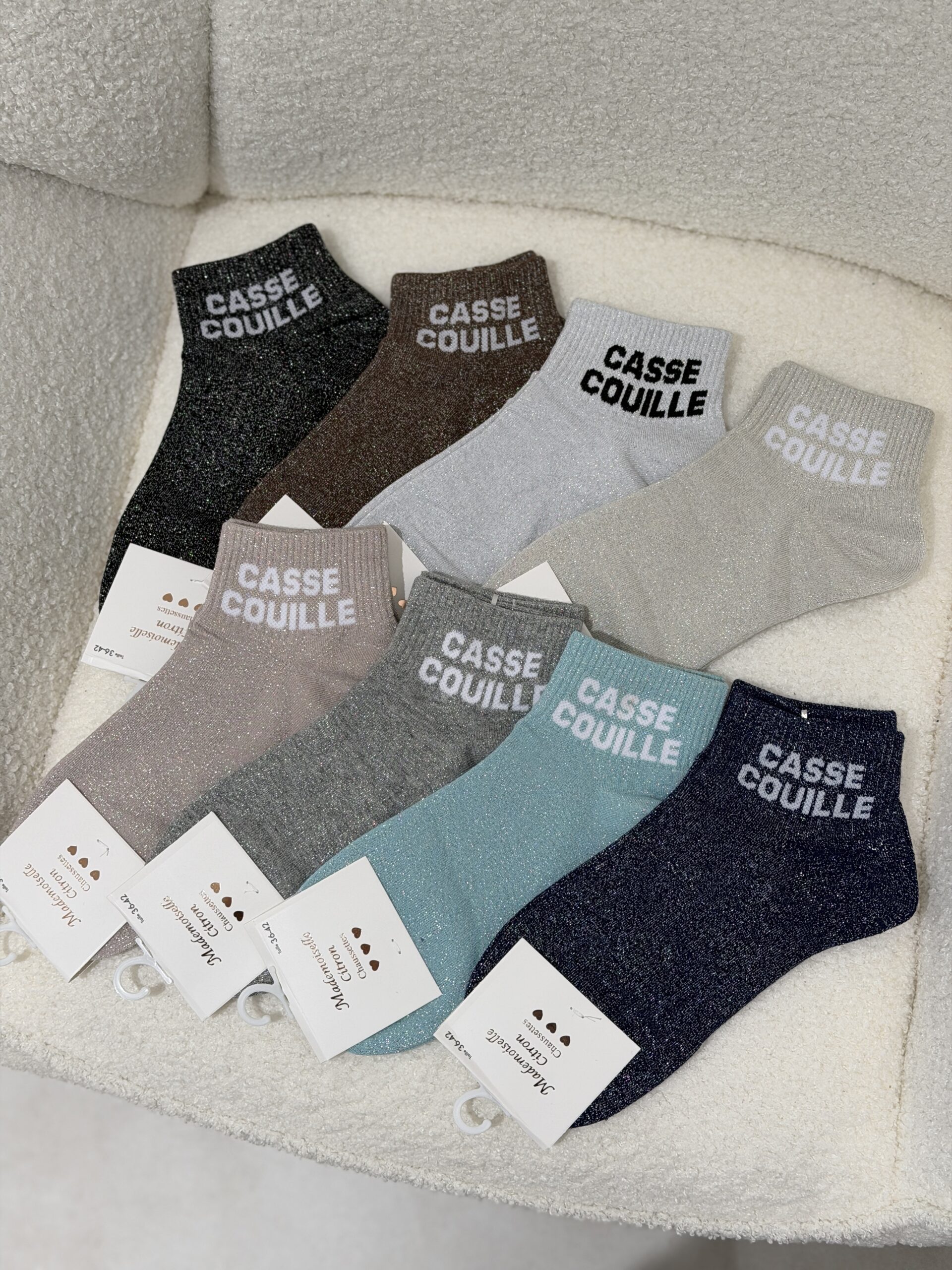 Chaussettes paillettes – CASSE COUILLE Courte Paire de chaussettes à paillettes Coloris : Argent, gris, marron, bleu , rose, noir, or/blanc, or/noir, vert Inscription : « casse couille « Taille 36-42 Composition : 77% coton, 21% polyester, 2% spandex