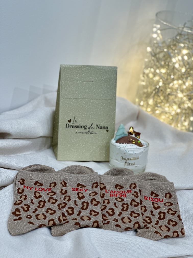 Chaussettes paillettes – LÉOPARD Paire de chaussettes à paillettes Coloris tacheté léopard Inscription : » Sexy, L’amour infini, My love & Bisou » Taille 36-40 Composition : 77% coton, 21% polyester, 2% spandex