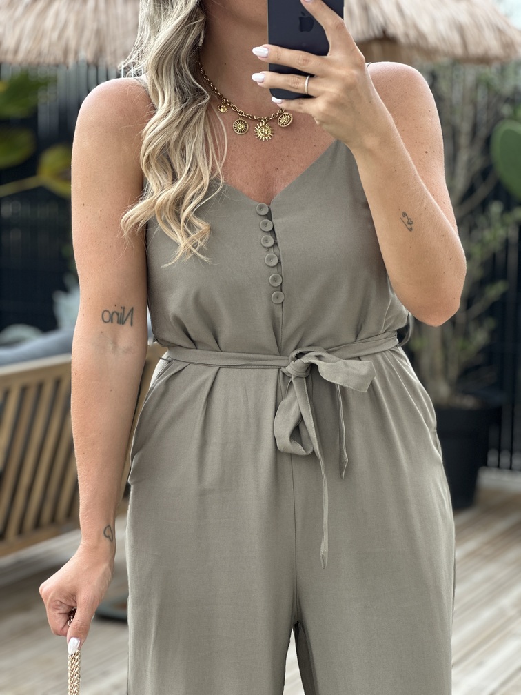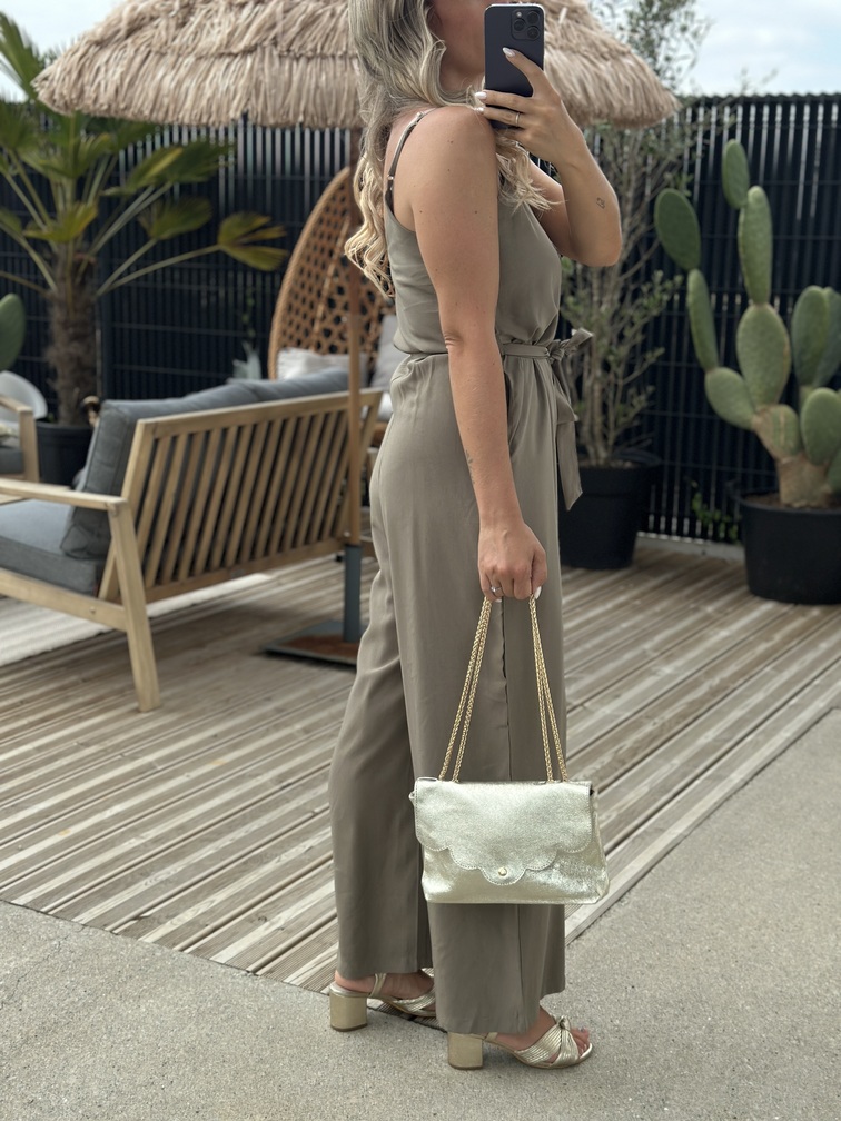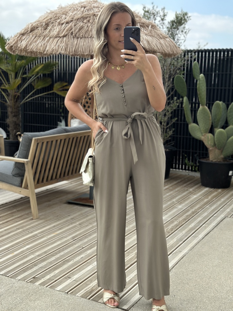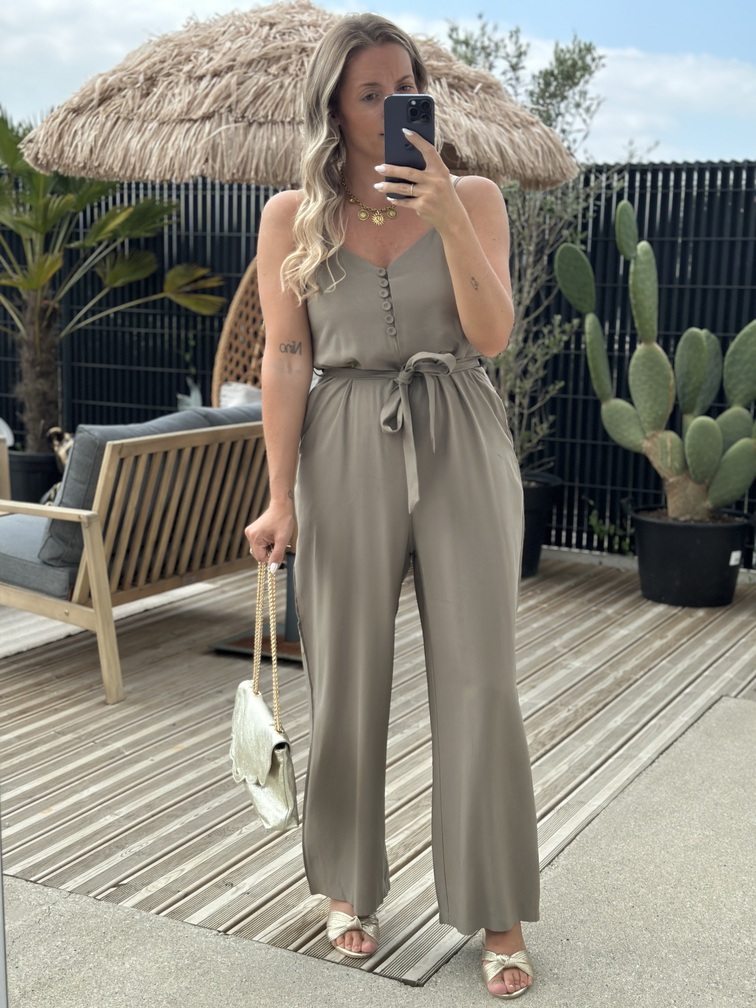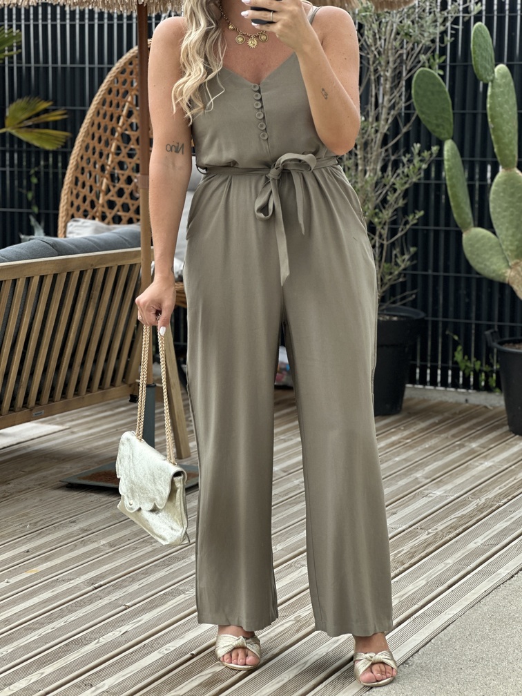COMBINAISON HALDA – KAKI Combinaison Couleur : kaki Col V Fines bretelles Ceinture Boutons Poches Tailles = S : 36, M : 38, L : 40 Longueurs = S : 131 cm, M : 132 cm, L : 133 cm Largeurs sous aisselles = S : 45 cm, M : 47 cm, L : 49 cm Composition : 92% viscose, 8% polyester Le modèle porte du S et mesure 1m65