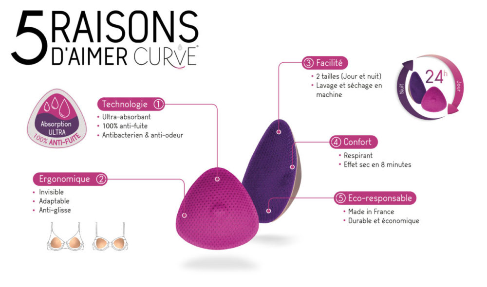 Les coussinets d’allaitement lavables Curve ont été étudié durant 2 ans dans les moindres détails en collaboration avec des experts et des mamans spécialistes de l’allaitement pour vous offrir un produit à la fois efficace et esthétique. Mélange de matières innovantes et performantes, le coussinet d’allaitement lavable Curve est éco-responsable puisque lavable en machine et réutilisable. De fabrication française, il respecte infiniment la peau des mamans allaitantes.