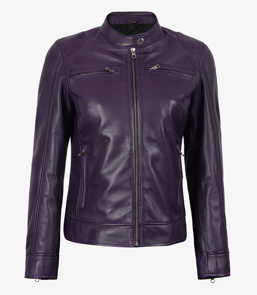 Veste en cuir violet à col chemise pour femme