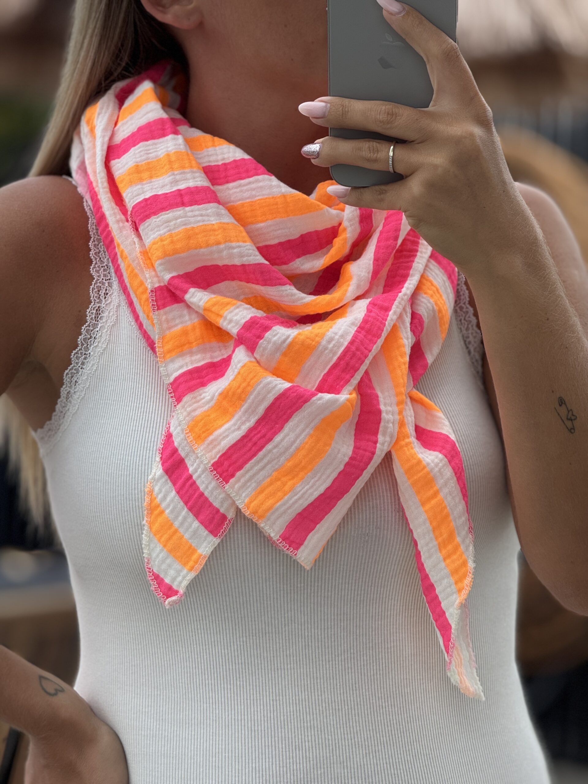 FOULARD OZIR Foulard Coloris : blanc, orange & fuchsia Rayé Gaze de coton Taille environ : 195 cm Composition : 100% coton