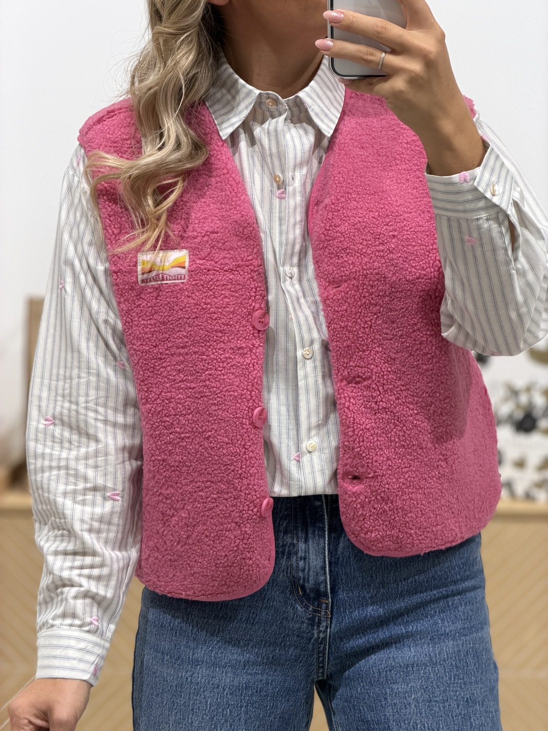 Gilet sans manches ÉLIE – Rose Gilet sans manches Couleur : rose Moumoute Boutons Écusson Coupe droite Tailles = S/M : 34/36/38, M/L : 38/40 Longueurs = S/M : 53 cm, M/L : 54 cm Largeurs sous aisselles = S/M : 53 cm, M/L : 55 cm Composition : 100% polyester Le modèle porte du S/M et mesure 1m65 Accessoires portés par le mannequin : Jean’s COREY, Blouse PRINTEMPS, Chemise WEBBY