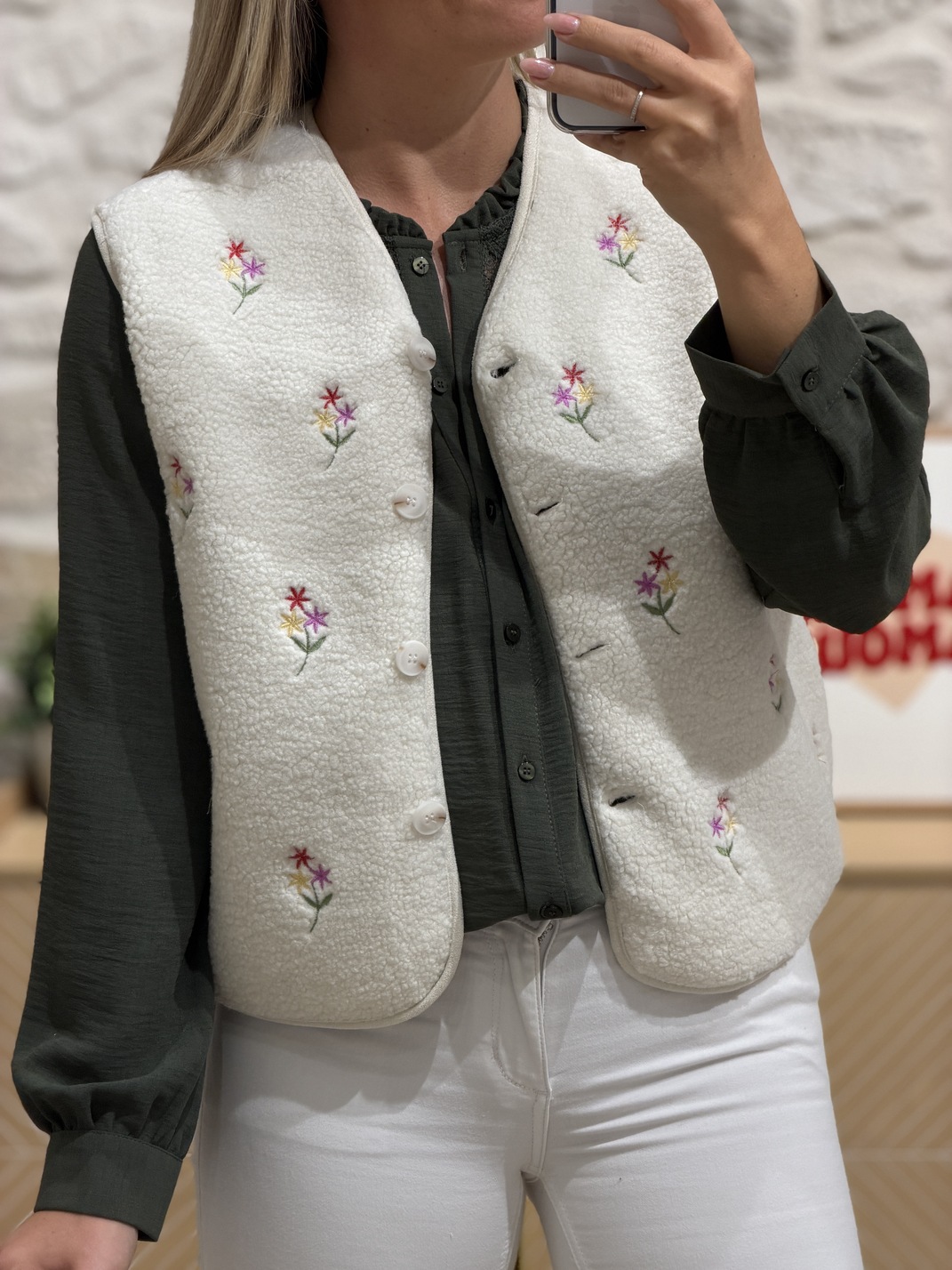 Gilet sans manches JALYCIA Gilet sans manches Coloris : écru, moutarde, rose & vert Moumoute Boutons Fleurs brodés Coupe droite Tailles = S/M : 34/36/38, M/L : 38/40 Longueurs = S/M : 53 cm, M/L : 54 cm Largeurs sous aisselles = S/M : 53 cm, M/L : 55 cm Composition : 100% polyester Le modèle porte du S/M et mesure 1m65 Accessoires portés par le mannequin : Blouse VANY Kaki, Jean’s NICKY Blanc