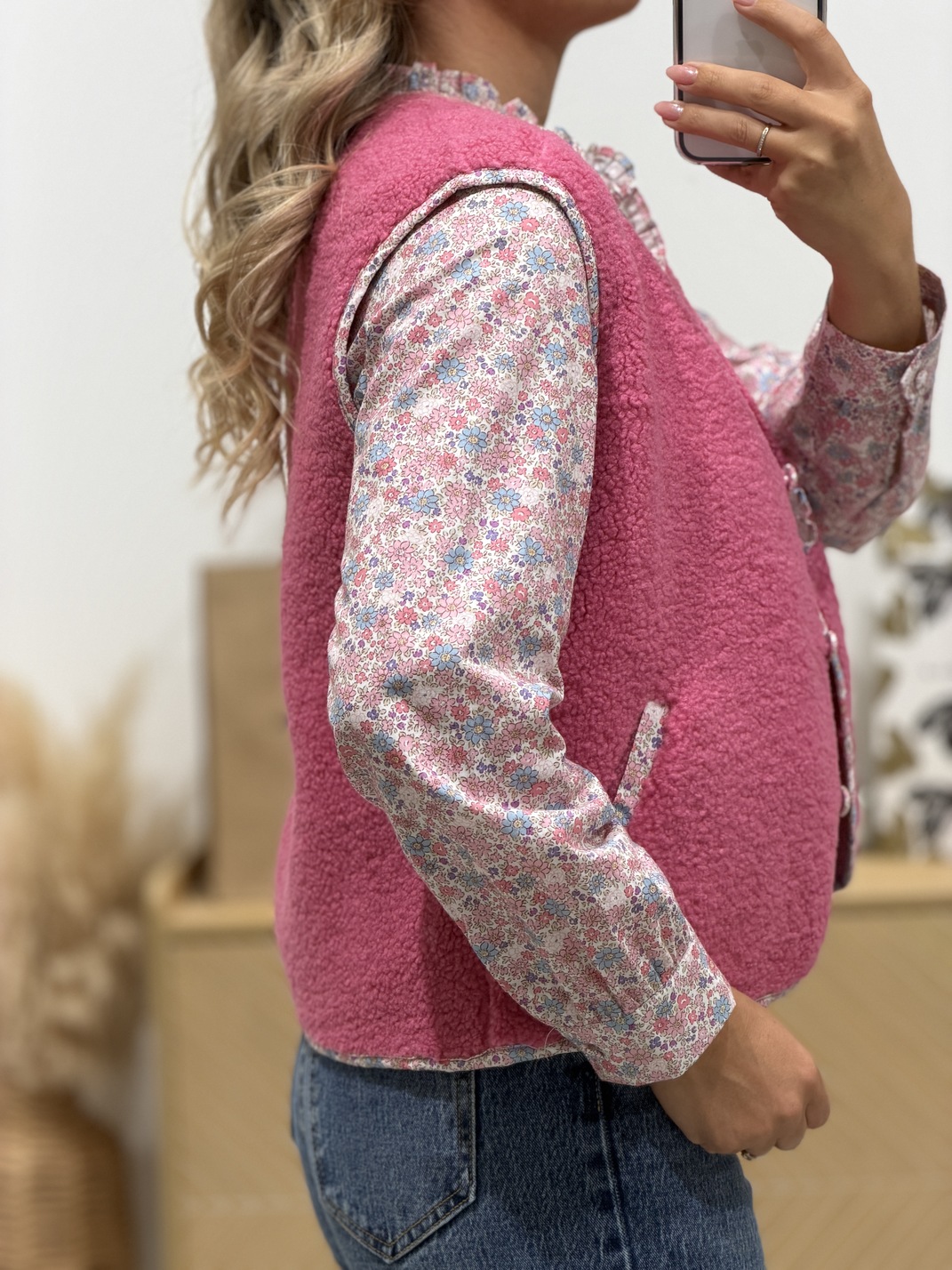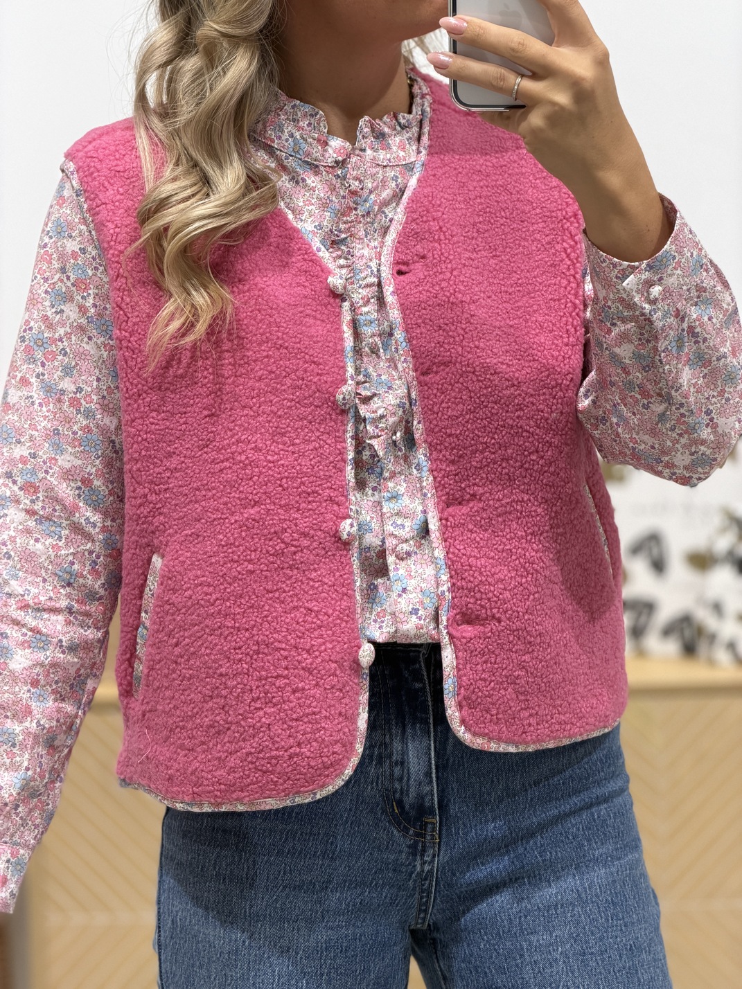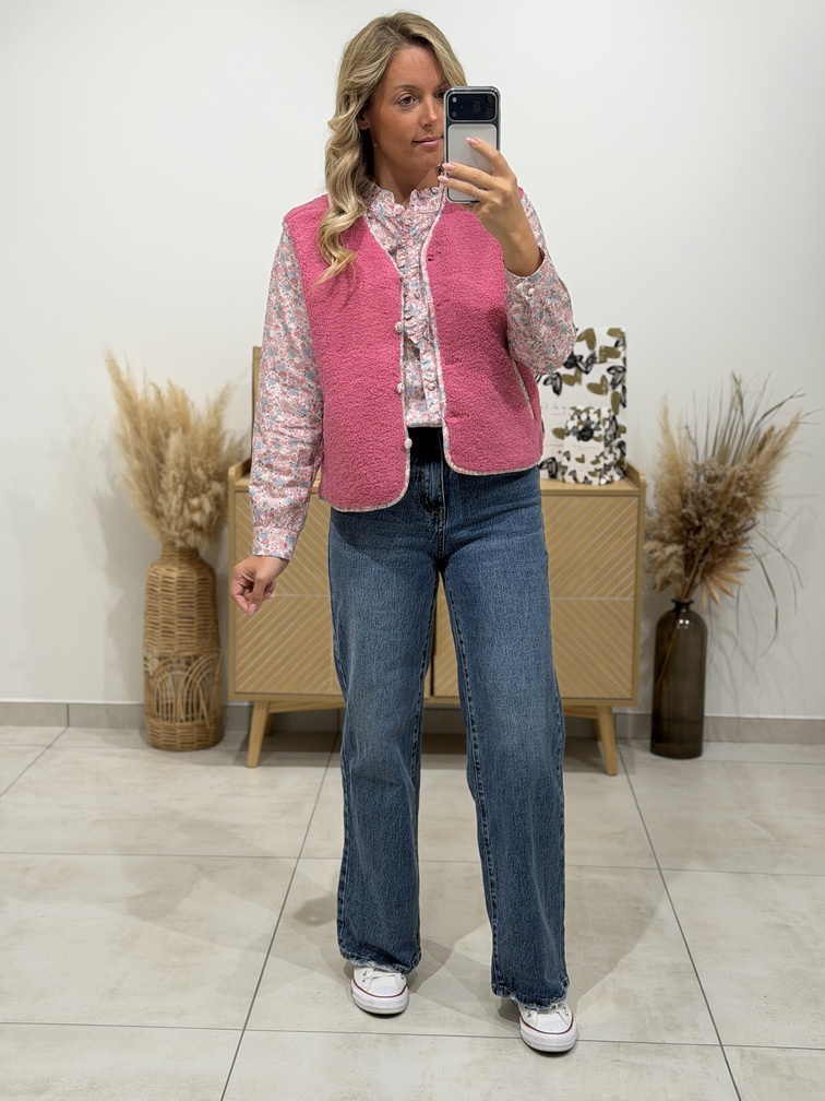 Gilet sans manches SHANNA – Rose Gilet sans manches Coloris : écru, rose & bleu Moumoute Boutons fleuris Poches fleuris Coupe droite Tailles = S/M : 34/36/38, M/L : 38/40 Longueurs = S/M : 53 cm, M/L : 54 cm Largeurs sous aisselles = S/M : 53 cm, M/L : 55 cm Composition : 100% polyester Le modèle porte du S/M et mesure 1m65 Accessoires portés par le mannequin : Blouse JOYCE Rose, Jean’s COREY