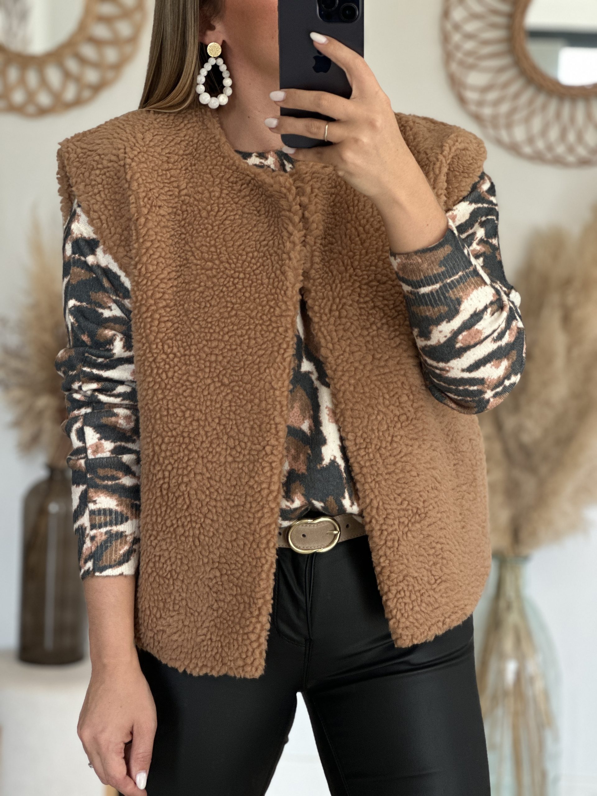 Gilet WOODY Camel Gilet Couleur : camel Très agréable à porter Ne se ferme pas Sans manches Moumoute Taille unique peut convenir du 36 au 42 Longueur : 60 cm Largeur sous aisselle : 51 cm Composition : 100% polyester Le modèle porte du S habituellement et mesure 1m65 Accessoires portés par le mannequin : Boucles […]