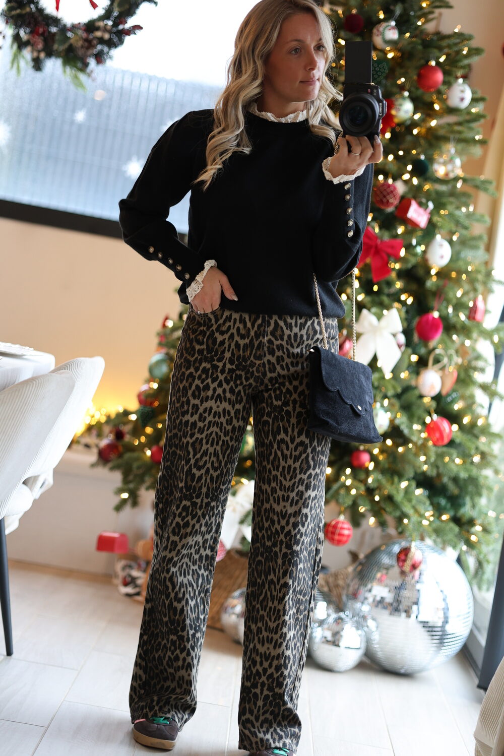Jean’s DAMIANO Jean’s Couleur : Noir & marron 2 poches à l’arrière Hyper confortable Coupe évasé Taille haute Imprimé léopard Tailles = XS : 34, S : 36, M : 38, L : 40, XL : 42 Composition : 98% coton, 2% élasthanne Le modèle porte du 36 et mesure 1m65 Accessoires portés par le mannequin : Pull MORGANE, Sac BENODET noir