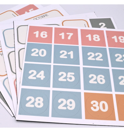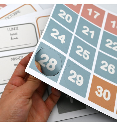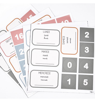 - 5 planches composé de 50 magnets : 7 magnets jours, 12 magnets mois et 31 magnets chiffres. Le plus : les enfants peuvent s’entrainer à écrire sur les étiquettes jours et mois avec un feutre à l’eau.
