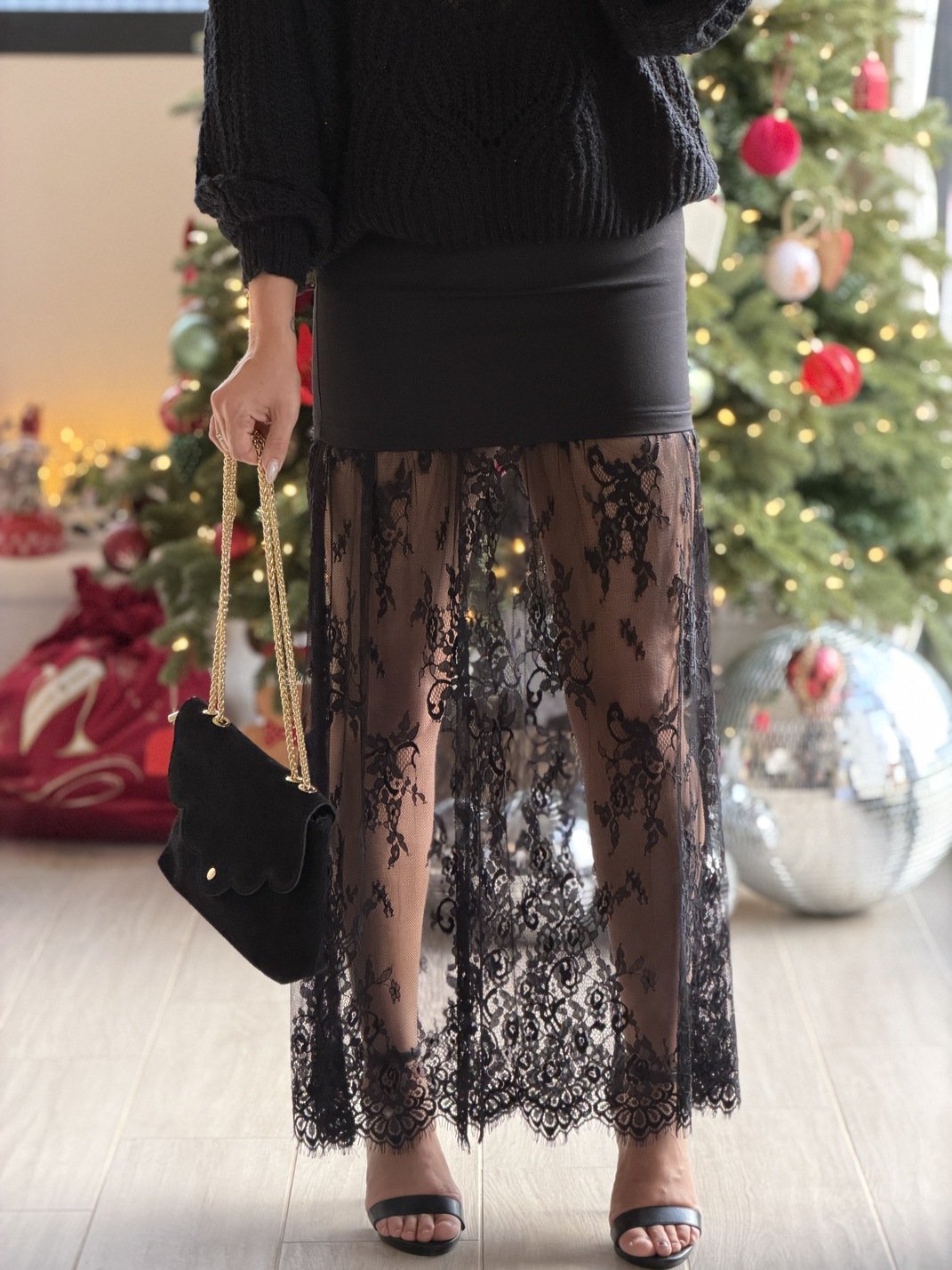 Jupe ADAMS Jupe longue Couleur : noire Doublée jusqu’aux milieu des cuisses Dentelles Tailles = S : 36, M : 38, L : 40 Longueurs = S : 100 cm, M : 101 cm, L : 102 cm Largeurs = S : 36 cm, M : 38 cm, L : 40 cm Composition : 75% polyester, 20% viscose, 5% élasthanne Le modèle porte du S et mesure 1m65