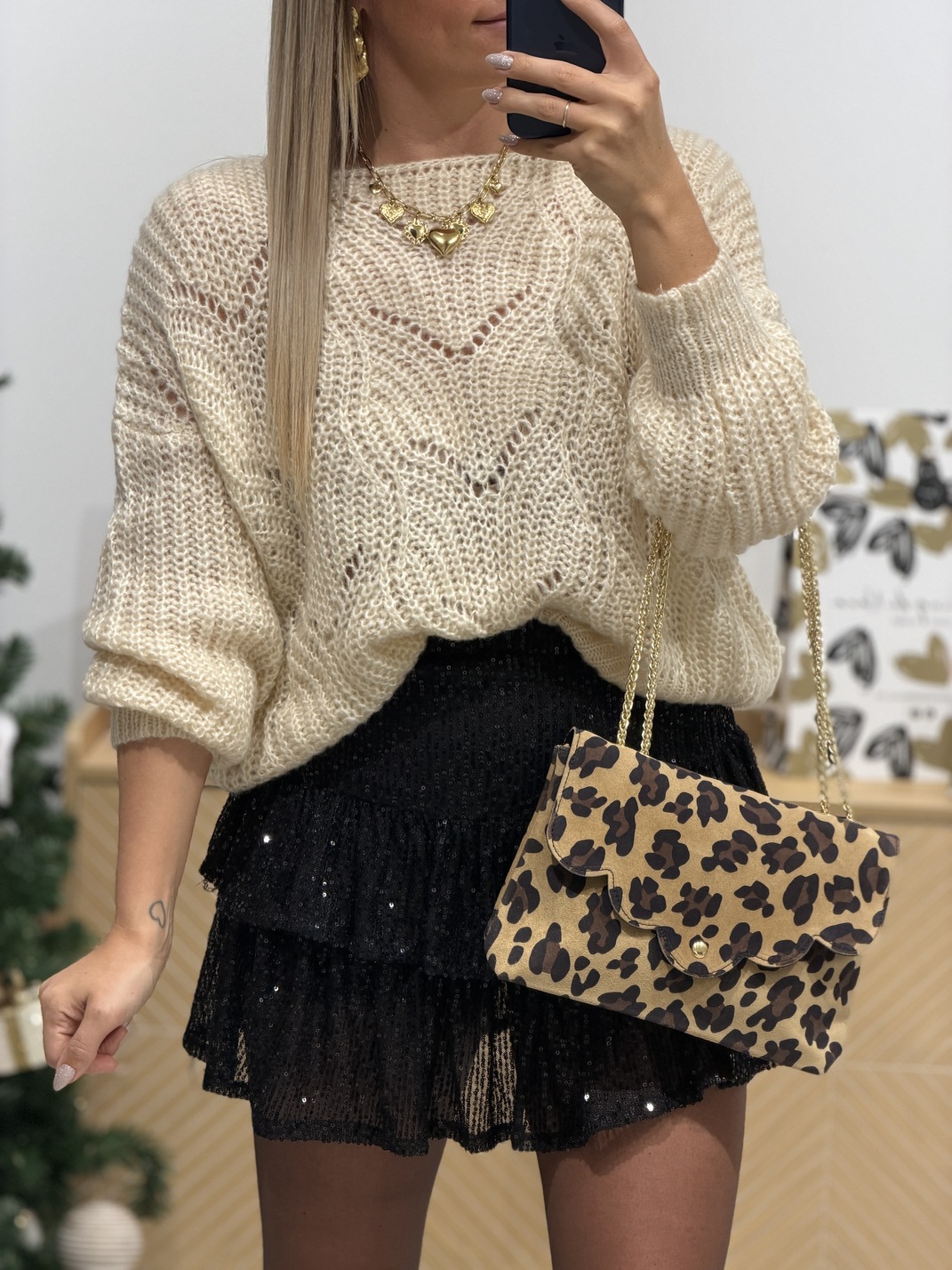 Jupe HELGA – Noir Jupe Coloris : Noir Elastique à la taille Très agréable à porter Sequins Taille = SM : 36/38, ML : 38/40 Longueur = SM : 42 cm, ML: 43 cm Largueur = SM: 32 cm, ML : 33 cm Composition = 95% polyester, 5% elastane Le modèle porte du S habituellement et mesure 1m65 Accessoires portés par le mannequin : Pull IMA Beige, Sac BENODET Léopard, Bottines EUDORA noir