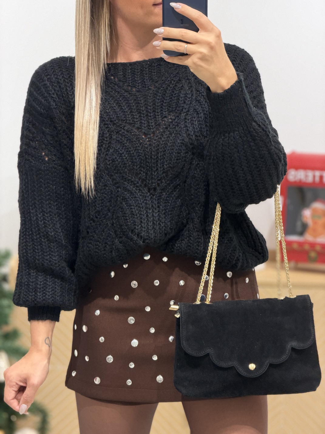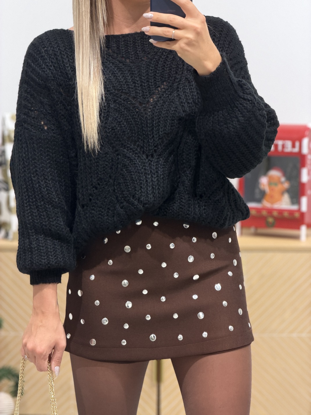 Jupe-short LÉONIE – MARRON Jupe-short Coloris : marron & argenté Clous Coupe regular (droite) Taille plutôt haute Tailles = S : 36, M : 38, L : 40, Longueur = S: 37 cm, M: 38 cm, L: 39 cm Largeur = S: 35 cm, M: 36 cm, L: 37 cm Composition : 97% polyester, 3% élasthanne Le modèle porte du S et mesure 1m65 Accessoires portés par le mannequin : Pull IMA Beige, Bottines EUDORA Noire, Sac BENODET Noir